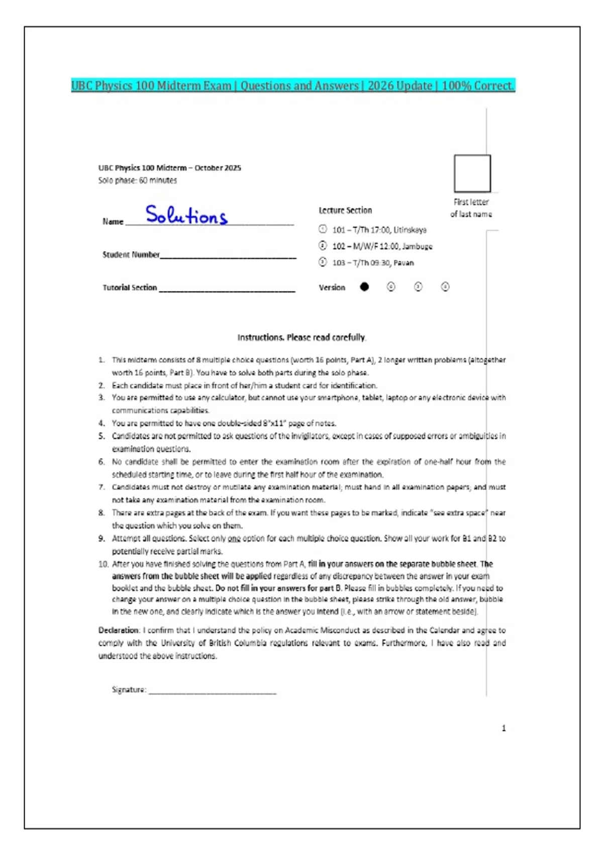 UBC Physics 100 Midterm Exam | Questions and Answers | 2026 Update | 100% Correct.