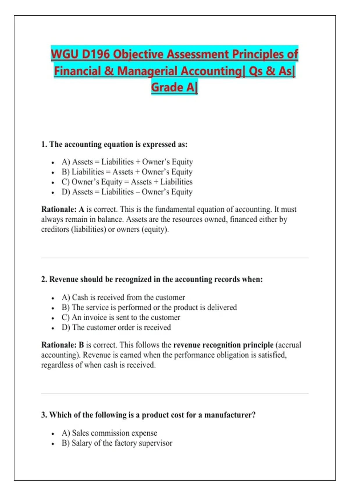 Rationale: A is correct. This is the fundamental equation of accounting. It must