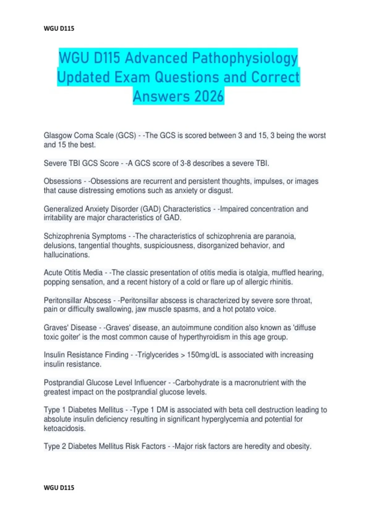 WGU D115 Advanced Pathophysiology Updated Exam Questions and Correct Answers 2026 Glasgow Coma Scale (GCS) - -The GCS is scored between 3 and 15, 3 being the worst and 15 the best. Severe TBI GCS Score - -A GCS score of 3-8 describes a severe TBI. Obsessions - -Obsessions are recurrent and persistent thoughts, impulses, or images that cause distressing emotions such as anxiety or disgust. Generalized Anxiety Disorder (GAD) Characteristics - -Impaired concentration and irritability are major characteristics of GAD. Schizophrenia Symptoms - -The characteristics of schizophrenia are paranoia, delusions, tangential thoughts, suspiciousness, disorganized behavior, and hallucinations. Acute Otitis Media - -The classic presentation of otitis media is otalgia, muffled hearing, popping sensation, and a recent history of a cold or flare up of allergic rhinitis. Peritonsillar Abscess - -Peritonsillar abscess is characterized by severe sore throat, pain or difficulty swallowing, jaw muscle spasms, and a hot potato voice. Graves' Disease - -Graves' disease, an autoimmune condition also known as 'diffuse toxic goiter' is the most common cause of hyperthyroidism in this age group. Insulin Resistance Finding - -Triglycerides > 150mg/dL is associated with increasing insulin resistance. Postprandial Glucose Level Influencer - -Carbohydrate is a macronutrient with the greatest impact on the postprandial glucose levels. Type 1 Diabetes Mellitus - -Type 1 DM is associated with beta cell destruction leading to absolute insulin deficiency resulting in significant hyperglycemia and potential for ketoacidosis. Type 2 Diabetes Mellitus Risk Factors - -Major risk factors are heredity and obesity. WGU D115 WGU D115 Endometrial Cancer Risk Factor - -Oral contraceptives have been shown to reduce the incidence of endometrial cancer. Mixed Precocious Puberty - -Mixed precocious puberty cases the child to develop some secondary characteristics of the opposite sex, such as the feminization of a boy. Delayed Puberty Cause - -In 95% of cases, delayed puberty is physiologic in nature. Priapism Association - -Priapism has been associated with the abuse of certain substances. Priapism - -Prolonged penile erection, often idiopathic. Cocaine - -Substance associated with priapism. Ovulation - -Triggered by a sudden increase of LH. Follicular cyst - -Develops when no dominant follicle matures. Benign ovarian cyst - -Functional cyst from incomplete follicle maturation. Genetic counseling - -Advisory service for individuals at genetic risk. Maternal age - -Common reason for seeking genetic counseling. Amniocentesis - -Procedure to perform genetic studies on fetus. Turner Syndrome - -Condition with monosomy X in affected cells. Cri du chat syndrome - -Genetic disorder with distinctive cat-like cry. Adaptive immunity - -Immune response mediated by T and B cells. Minimally conscious state - -Patient shows limited but definite responses. Acute respiratory distress syndrome (ARDS) - -Severe lung inflammation with bilateral infiltrates. Capillary hydrostatic pressure - -Increased pressure causing pulmonary edema. Immunoglobulin E (IgE) - -Antibody involved in asthma pathophysiology. Airway remodeling - -Long-term damage from uncontrolled airway inflammation. Angiotensin II - -Hormone linked to myocardial hypertrophy in hypertension. WGU D115 WGU D115 Hypertrophy of myocardium - -Heart muscle thickening due to increased load. Blood pressure measurement - -First reading indicates hypertension if elevated. Sickle cell disease - -Blood disorder associated with priapism. Spinal cord trauma - -Potential cause of priapism. Pelvic tumors - -Associated with priapism in some cases. Leukemia - -Blood cancer linked to priapism. High-pitched cry - -Characteristic symptom of cri du chat syndrome. Hypotonia - -Reduced muscle tone seen in cri du chat. Microcephaly - -Small head size, symptom of cri du chat. Hypertelorism - -Widely spaced eyes, seen in cri du chat. Bilateral infiltrates - -Key feature in diagnosing ARDS. Decreased pulmonary compliance - -Characteristic of ARDS, indicating stiff lungs. Assessment of lifestyle and risk factors - -A comprehensive evaluation of an individual's habits and potential health risks. CBC - -Complete Blood Count, a blood test used to evaluate overall health and detect a variety of disorders. BMP - -Basic Metabolic Panel, a blood test that measures glucose, calcium, and electrolytes. UA - -Urinalysis, a test that examines the content of urine to assess health. Initiation of anti-hypertensive medications - -The process of starting medication to lower high blood pressure, contingent upon confirmed diagnosis. Diagnosis of hypertension - -Determined by measuring blood pressure on at least two separate occasions, averaging at least 2 minutes apart. Left-sided heart failure - -A condition where the left side of the heart cannot pump blood effectively, leading to fluid accumulation in the lungs. Untreated hypertension - -High blood pressure that is not managed, leading to increased workload on the left ventricle and potential heart failure. WGU D115 WGU D115 Electrolyte imbalances in heart failure - -Changes in serum electrolyte levels, commonly resulting in hyponatremia and hypokalemia due to compensatory mechanisms. Dyspnea and pulmonary congestion - -Primary symptoms associated with left-sided heart failure, characterized by difficulty breathing and fluid in the lungs. Chronic lymphocytic leukemia - -The most common leukemia in older adults, characterized by the proliferation of immature lymphocytes. Pernicious anemia - -A macrocytic, normochromic anemia resulting from atrophic gastric mucosa not secreting intrinsic factor. Tumor lysis syndrome - -A condition that occurs when high WBC counts lead to acute hyperuricemia, hyperkalemia, hyperphosphatemia, and hypocalcemia. Pancytopenia - -A deficiency of all types of blood cells. Leukostasis - -Occurs when blood vessels become overcrowded with immature blast cells in patie