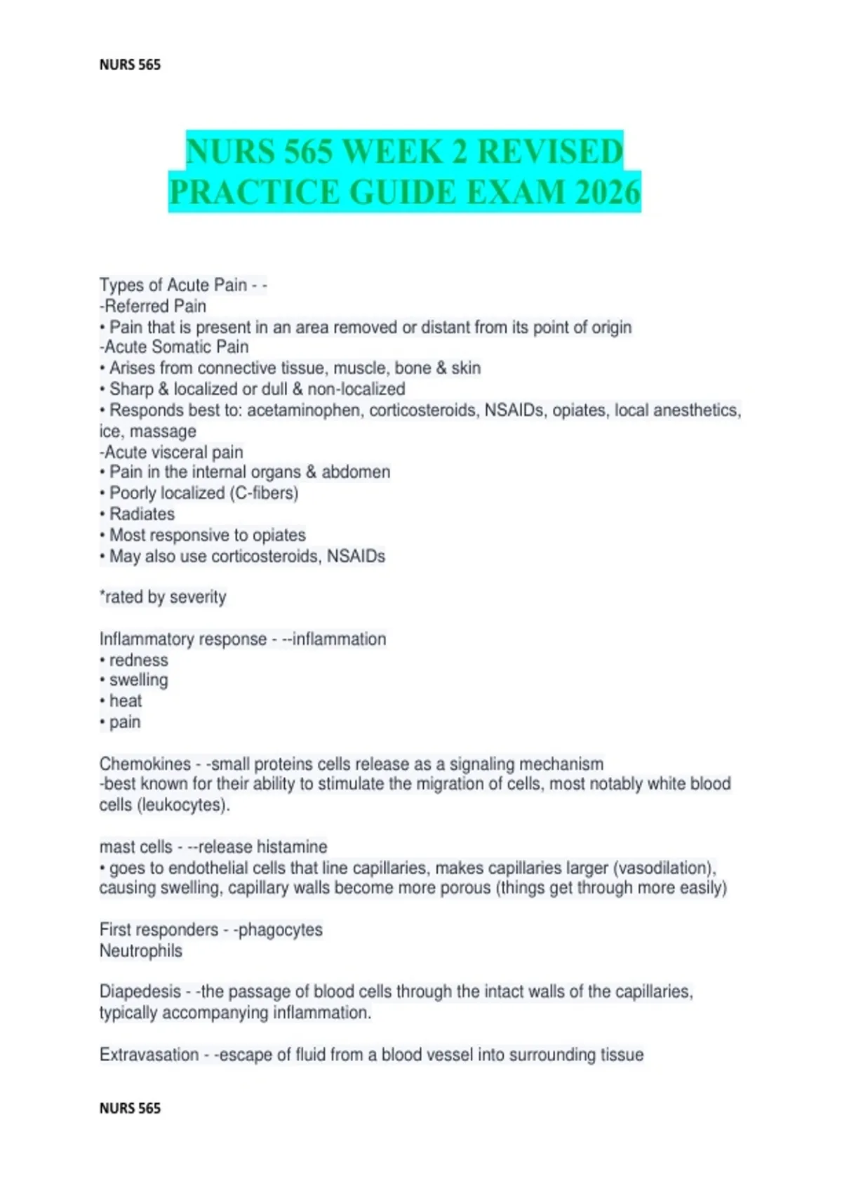 NURS 565 WEEK 2 REVISED PRACTICE GUIDE EXAM 2026 Types of Acute Pain - - -Referred Pain • Pain that is present in an area removed or distant from its point of origin -Acute Somatic Pain • Arises from connective tissue, muscle, bone & skin • Sharp & localized or dull & non-localized • Responds best to: acetaminophen, corticosteroids, NSAIDs, opiates, local anesthetics, ice, massage -Acute visceral pain • Pain in the internal organs & abdomen • Poorly localized (C-fibers) • Radiates • Most responsive to opiates • May also use corticosteroids, NSAIDs *rated by severity Inflammatory response - --inflammation • redness • swelling • heat • pain Chemokines - -small proteins cells release as a signaling mechanism -best known for their ability to stimulate the migration of cells, most notably white blood cells (leukocytes). mast cells - --release histamine • goes to endothelial cells that line capillaries, makes capillaries larger (vasodilation), causing swelling, capillary walls become more porous (things get through more easily) First responders - -phagocytes Neutrophils Diapedesis - -the passage of blood cells through the intact walls of the capillaries, typically accompanying inflammation. Extravasation - -escape of fluid from a blood vessel into surrounding tissue NURS 565 NURS 565 Pain is influenced by: - -gender, genetics, social, cultural, and personal factors Acute pain has an occurrence of fewer than __________ - -three months -often precipitated by trauma & acute medical conditions or tx Treatment goals about pain relief: Considerations - --reducing the intensity of pain while enhancing physical & psychological functioning -common goal is to resume the activities of daily life -Complete elimination of pain is often not realistic if the source of pain continues to exist • finding the lowest effective dose to achieve tolerable pain levels is paramount -Non-pharmacological treatments may also be considered to promote comfort Appropriate selection of medications includes: - --Patient factors • age, ethnicity, gender, the presence of hepatic and/or renal impairment, genetic polymorphisms, and/or coexisting cardiorespiratory or cerebrovascular disease -Drug factors • Drug metabolism, receptor binding strength, potential for drug-drug interactions, and/or co-administration with other CNS depressants Commonly used agents for acute pain management - --Opioids -Acetaminophen -NSAIDs -Salicylates -COX-2 Inhibitors Opioids - --Drug Indication: • Moderate to severe pain -Dosing Considerations: • Opioid naïve vs chronic pain patient -Adverse Drug Reactions: • Sedation, drowsiness, mental clouding; constipation; nausea & decreased appetite; sexual dysfunction; tolerance/ dependency • ADRs worse when combined with alcohol or benzodiazepines -Patient Education: • Clear instructions regarding safety & ADRs • discuss length of tx; discuss non-opiate therapy -Monitoring: • Is pain medication effective? Is the dose being tapered or discontinued? If not reassess cause of pain. -Drug Interaction: • Any other drug that causes a sedative effect. Acetaminophen - --Drug Indication: • Mild to moderate pain -Dosing Considerations: Dose appropriately NURS 565 NURS 565 • Mild pain: 325 to 650 mg q4-6 hrs • Children: 10/kg/mg every 4 to 8 hours • Moderate pain: 500 to 1,000 mg q4-6 hrs drugging indication used for fever • Max: 4 gms/ 24 hrs use for fever &/or pain • Children: 15 mg/kg/dose -Adverse Drug Reactions: • Usually well-tolerated • Hepatic injury with overdose • Renal disease with chronic use -Drug interactions: • alcohol -Patient Education: • Do not exceed maximum dose (4gm/24 hours) -Monitoring: • Monitor for effectiveness. May need to add an opioid agonist -Drug Interaction: • None NSAIDS - --Drug Indication: • Use for fever &/or pain • inflammation as an antiplatelet -Avoid in pregnancy & renal dysfunction -Dosing Considerations: -Ibuprofen dosing: • 200-800 mg/ dose every 6-8 hrs • Maximum: 3,200 mg/day • Children: 5 to 10 mg/kg/dose (Pediatric dosage maximum is 40mg/kg/day) -Naproxen dosing: • 500mg Then 500mg every 12 hours or 250mg every 6-8 hrs • Maximum: 1,250 mg/day •-Adverse Drug Reactions: • Gastrointestinal (GI) upset, dyspepsia, abdominal pain, GI bleed, fluid retention, edema, hypertension, renal damage Salicylates - --Drug Indication: • Use for fever, pain, inflammation, antiplatelet use. -Avoid in pregnancy, children, & renal dysfunction. -Dosing Considerations: • Dosing for pain: 325 mg to 1,000 mg q4-6 hrs (max: 4 gm/day) • Arthritis: 3.6 to 5.4 gm/day in divided doses -Adverse Drug Reactions: • GI upset, dyspepsia, abdominal pain, GI bleed, renal impairment, tinnitus -Monitoring: • Monitor for effectiveness. May need to add an opioid agonist COX-2 Inhibitors - --Drug Indication: NURS 565 NURS 565 • Use for pain &/or inflammation. -Avoid in pregnancy, children, renal dysfunction, pain after coronary artery bypass graft surgery, use caution in heart failure, hypertension, & fluid retention -Dosing Considerations: • pts with renal impairment & cardiovascular disease -Adverse Drug Reactions: • GI upset, abdominal pain, GI bleed, edema, HTN, thrombi events (myocardial infarction & stroke), fluid retention, renal impairment, poor metabolizers of CYP2C9 -Patient Education: • Avoid alcohol use. • Avoid aspirin & OTC medications. • May increase risk of myocardial infarction or stroke -Monitoring: • Monitor for effectiveness. May need to add an opioid agonist. -Drug Interaction: • Drugs that inhibit CYP2C9, drugs that are metabolized by CYP2D6, increased risk of renal failure with angiotensin-converting enzyme inhibitors Chronic Pain Management - -Pain that persists beyond three months or the expected time of healing is chronic -Agents used to manage are often the same ones used to manage acute pain Special Considerations in Opioid Medication Management - --An opioid is an agent