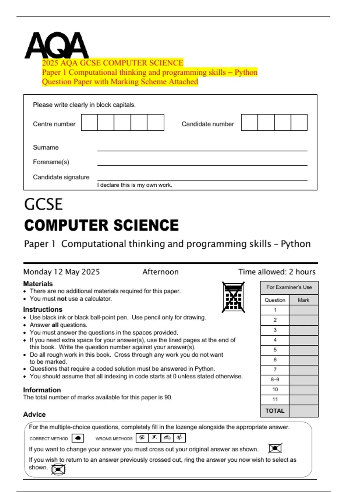 2025 AQA GCSE COMPUTER SCIENCE Paper 1 Computational thinking and programming skills – Python Question Paper with Marking Scheme Attached