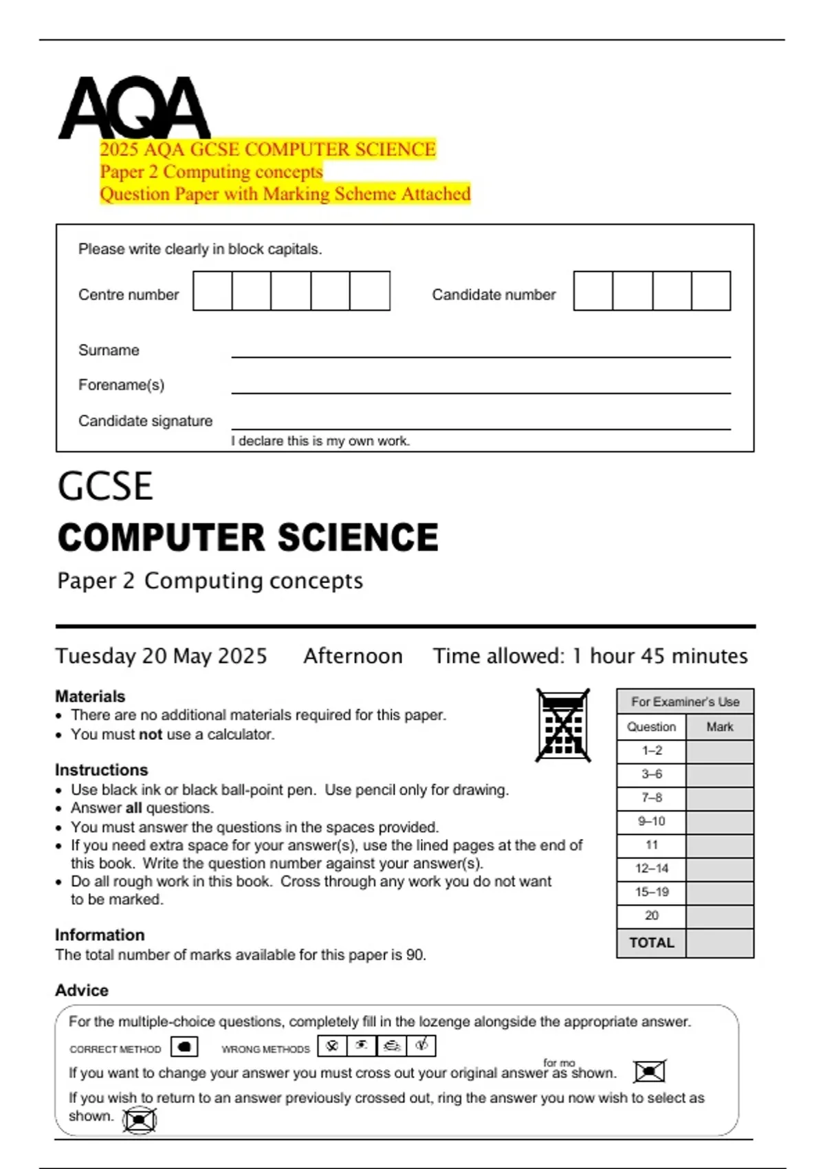 2025 AQA GCSE COMPUTER SCIENCE Paper 2 Computing concepts Question Paper with Marking Scheme Attached