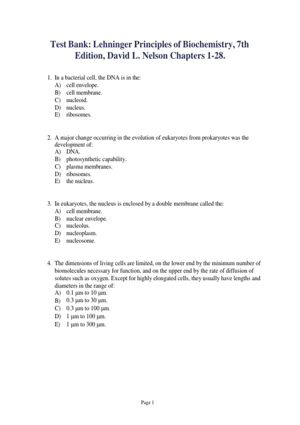 Test Bank: Lehninger Principles of Biochemistry, 7th