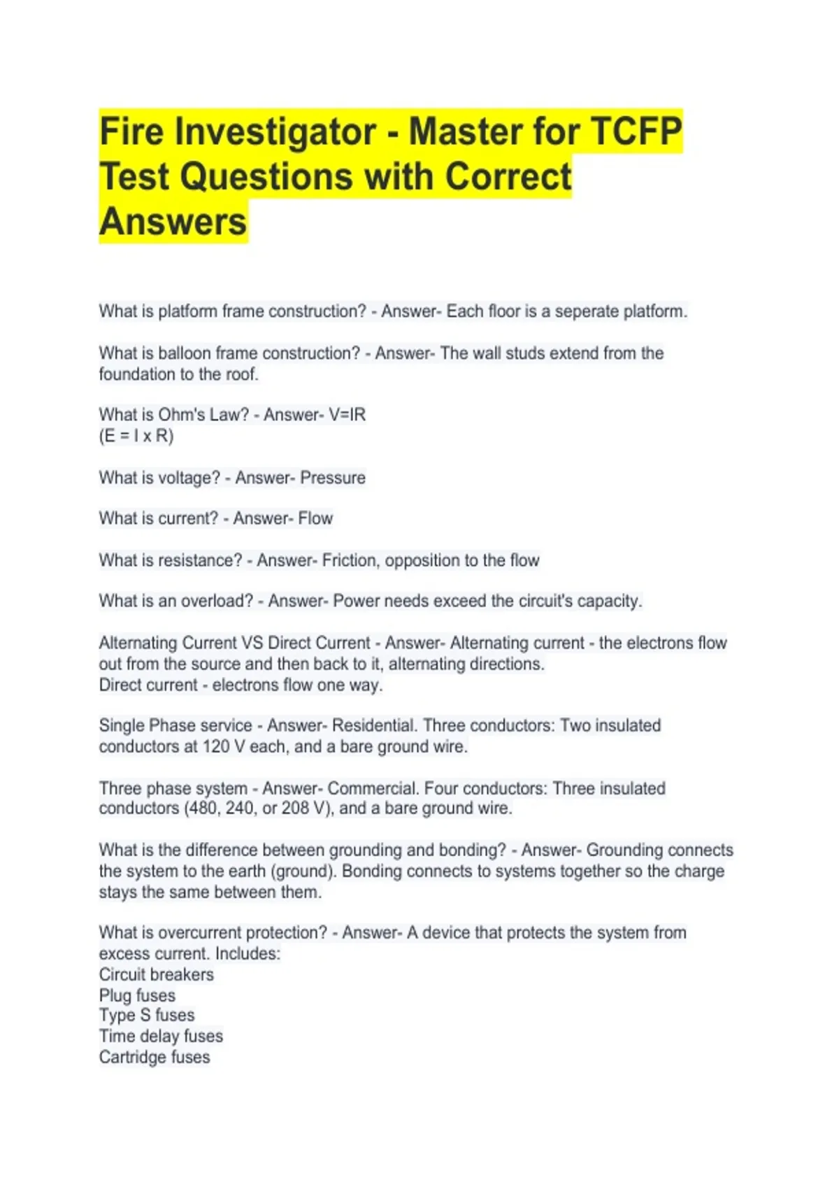 Fire Investigator - Master for TCFP Test Questions with Correct Answers