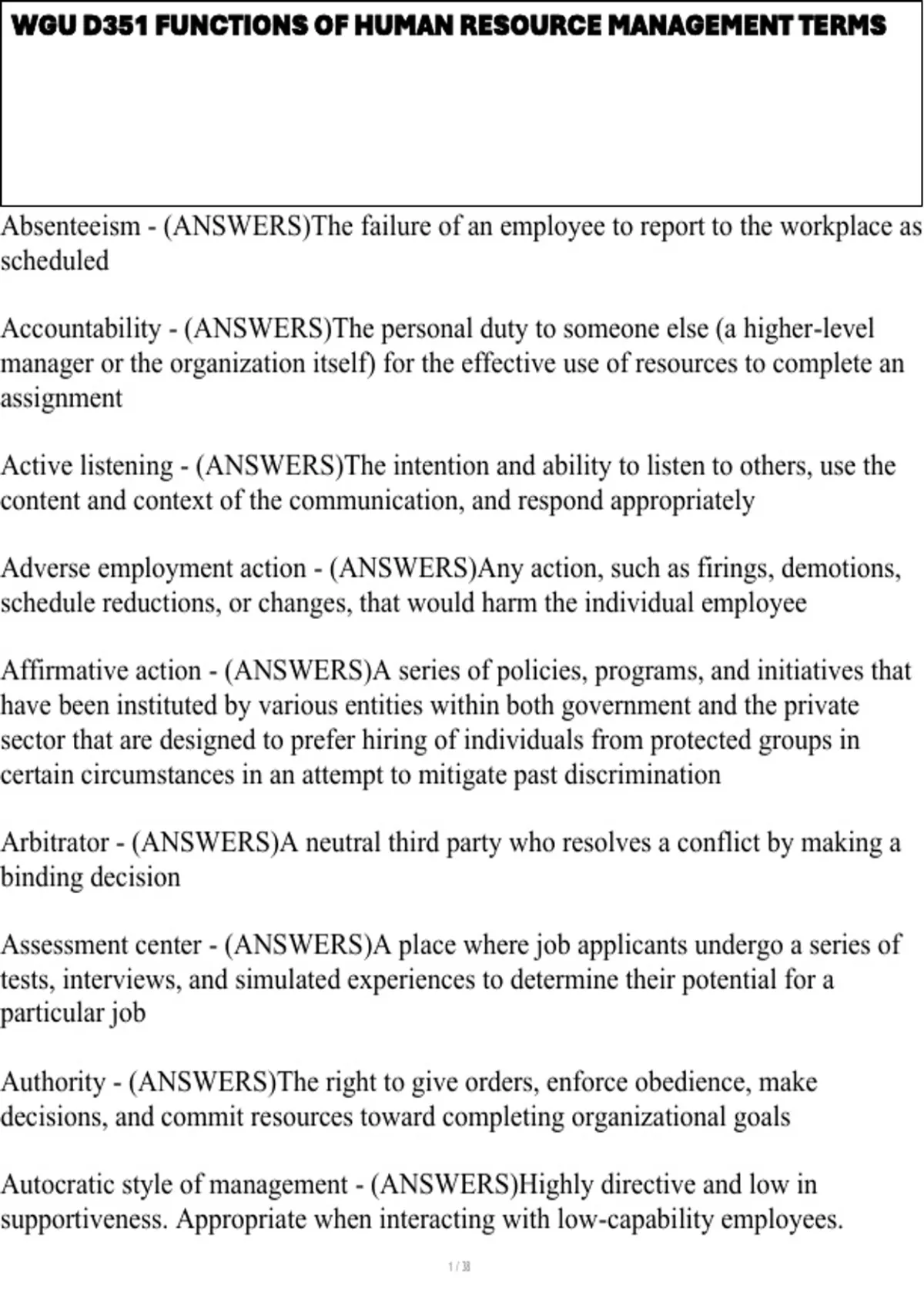 , WGU D351 FUNCTIONS OF HUMAN RESOURCE MANAGEMENT TERMS