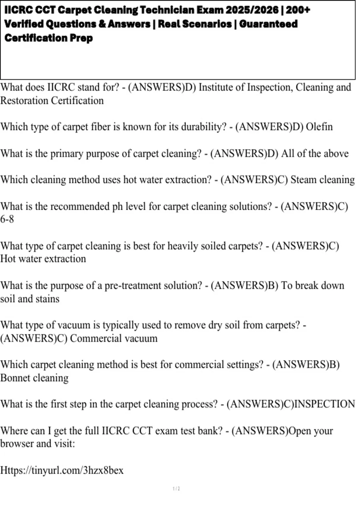 IICRC CCT Carpet Cleaning Technician Exam 2025/2026 | 200+ Verified Questions & Answers | Real Scenarios | Guaranteed Certification Prep