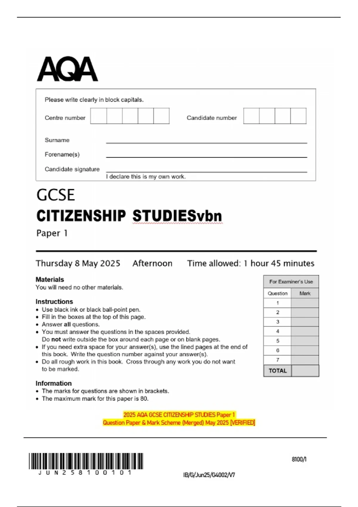2025 AQA GCSE CITIZENSHIP STUDIES Paper 1 Question Paper & Mark Scheme (Merged) May 2025 [VERIFIED]