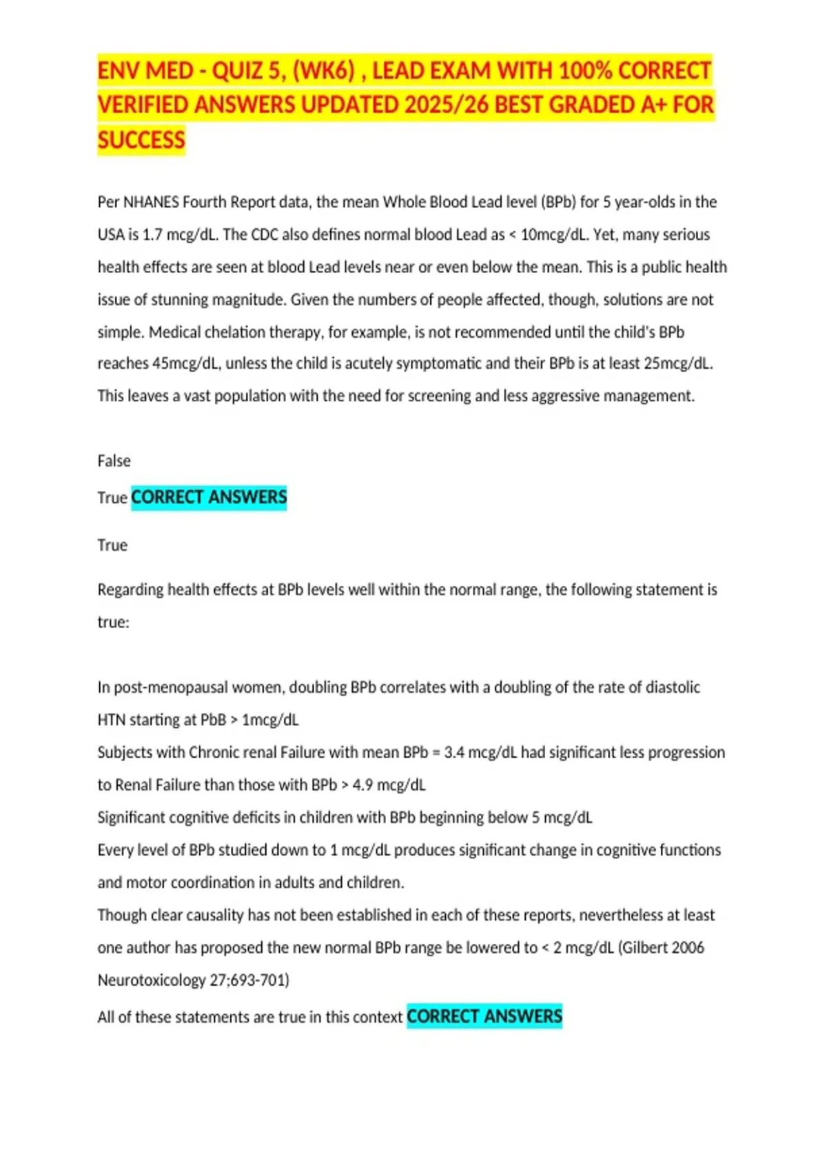 , ENV MED - QUIZ 5, (WK6) , LEAD EXAM WITH 100% CORRECT