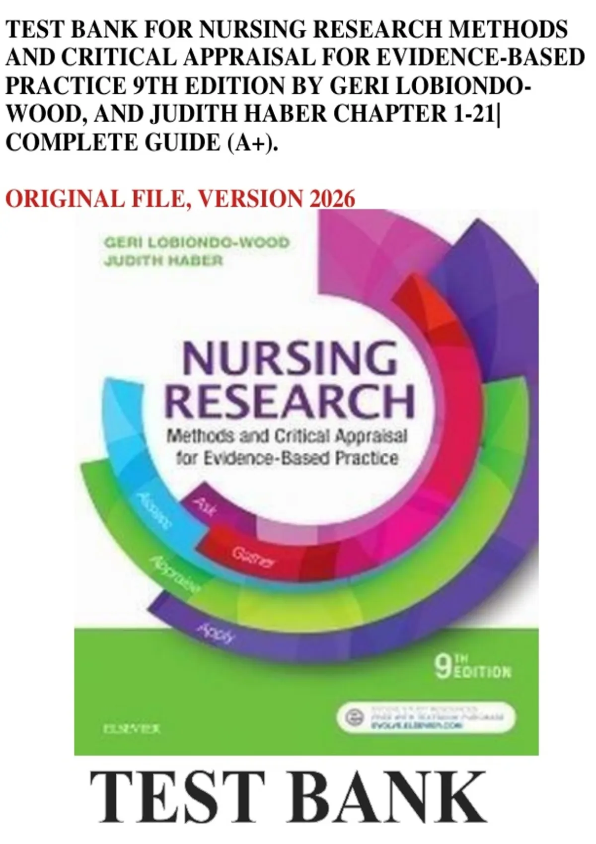 Nursing Research: Methods and Critical Appraisal for Evidence-Based Practice 9th Edition by Geri LoBiondo-Wood & Judith Haber. Comprehensive test bank aligned to each chapter of this foundational research textbook covering research fundamentals, evidence-based practice principles, qualitative and quantitative methodologies, critical appraisal techniques, data analysis concepts, and application of research to nursing practice. Supports mastery of key research concepts and exam preparation for nursing students and professionals. ISBN: 9780323431316 Part I Overview of Research and Evidence-Based Practice 1 Integrating Research, Evidence-Based Practice, and Quality Improvement Processes 2 Research Questions, Hypotheses, and Clinical Questions 3 Gathering and Appraising the Literature 4 Theoretical Frameworks for Research Part II Qualitative Research 5 Introduction to Qualitative Research 6 Qualitative Approaches to Research 7 Appraising Qualitative Research Part III Quantitative Research 8 Introduction to Quantitative Research 9 Experimental and Quasi-Experimental Designs 10 Nonexperimental Designs 11 Systematic Reviews and Clinical Practice Guidelines 12 Sampling 13 Legal and Ethical Issues 14 Data Collection Methods 15 Reliability and Validity 16 Data Analysis: Descriptive and Inferential Statistics 17 Understanding Research Findings 18 Appraising Quantitative Research Part IV Application of Research 19 Strategies and Tools for Developing an Evidence-Based Practice 20 Developing an Evidence-Based Practice 21 Quality Improvement