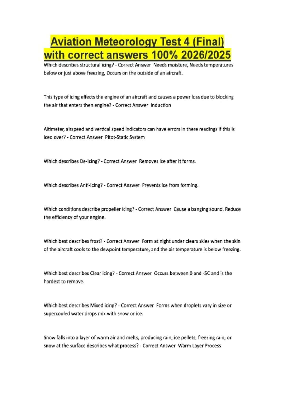 Aviation Meteorology Test 4 (Final) with correct answers 100% 2026/2025 Which describes structural icing? - Correct Answer Needs moisture, Needs temperatures below or just above freezing, Occurs on the outside of an aircraft. This type of icing effects the engine of an aircraft and causes a power loss due to blocking the air that enters then engine? - Correct Answer Induction Altimeter, airspeed and vertical speed indicators can have errors in there readings if this is iced over? - Correct Answer Pitot-Static System Which describes De-Icing? - Correct Answer Removes ice after it forms. Which describes Anti-Icing? - Correct Answer Prevents ice from forming. Which conditions describe propeller icing? - Correct Answer Cause a banging sound, Reduce the efficiency of your engine. Which best describes frost? - Correct Answer Form at night under clears skies when the skin of the aircraft cools to the dewpoint temperature, and the air temperature is below freezing. Which best describes Clear icing? - Correct Answer Occurs between 0 and -5C and is the hardest to remove. Which best describes Mixed icing? - Correct Answer Forms when droplets vary in size or supercooled water drops mix with snow or ice. Snow falls into a layer of warm air and melts, producing rain; ice pellets; freezing rain; or snow at the surface describes what process? - Correct Answer Warm Layer Process When larger droplets fall and collide with smaller