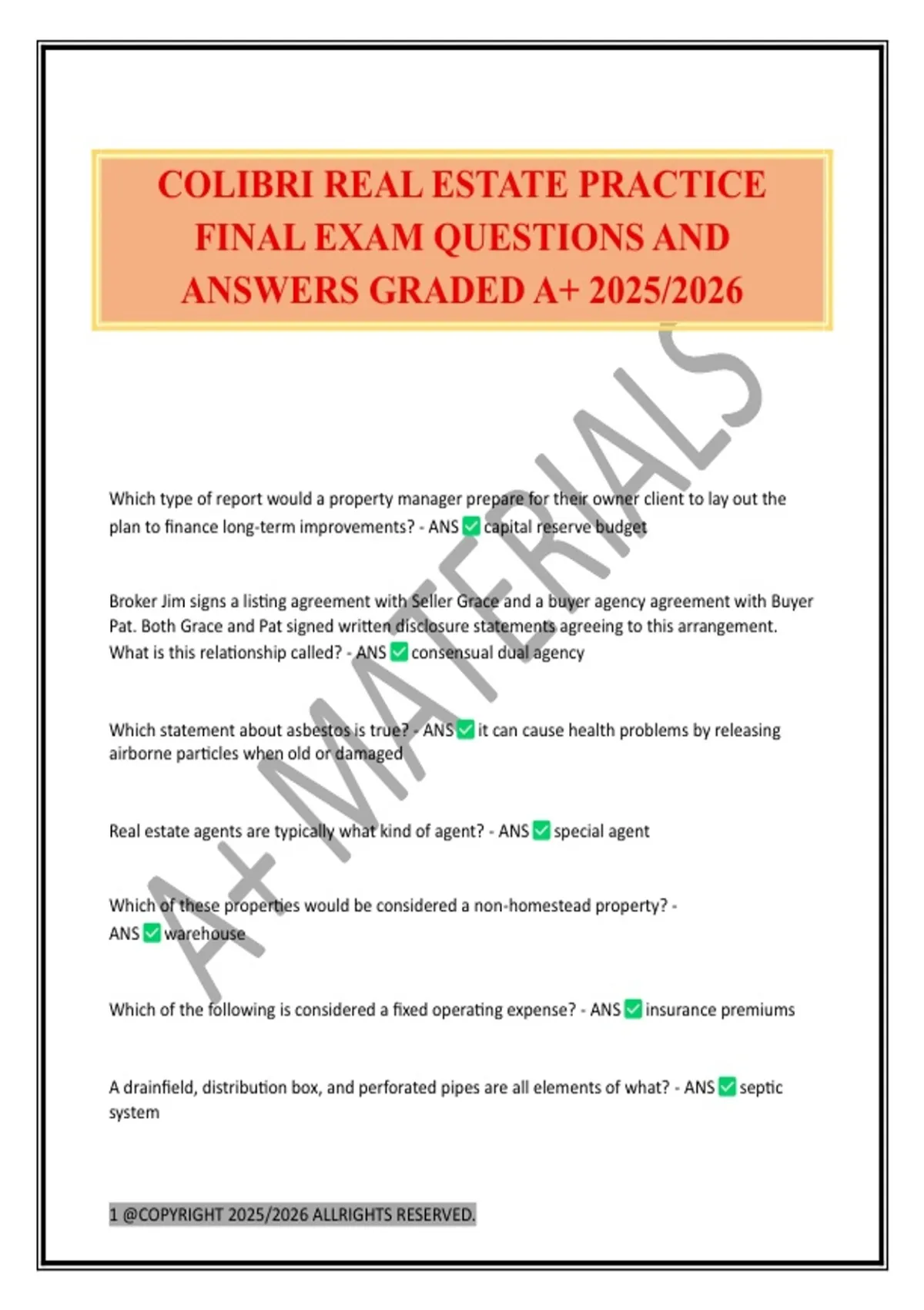 COLIBRI REAL ESTATE PRACTICE FINAL EXAM QUESTIONS AND ANSWERS GRADED A+ 2025/2026