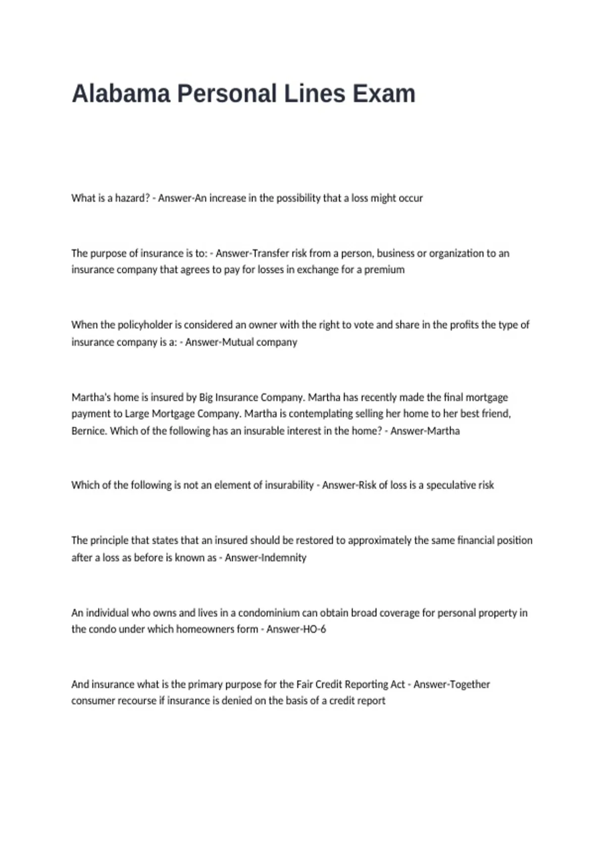 Alabama Personal Lines Exam Questions and Answers