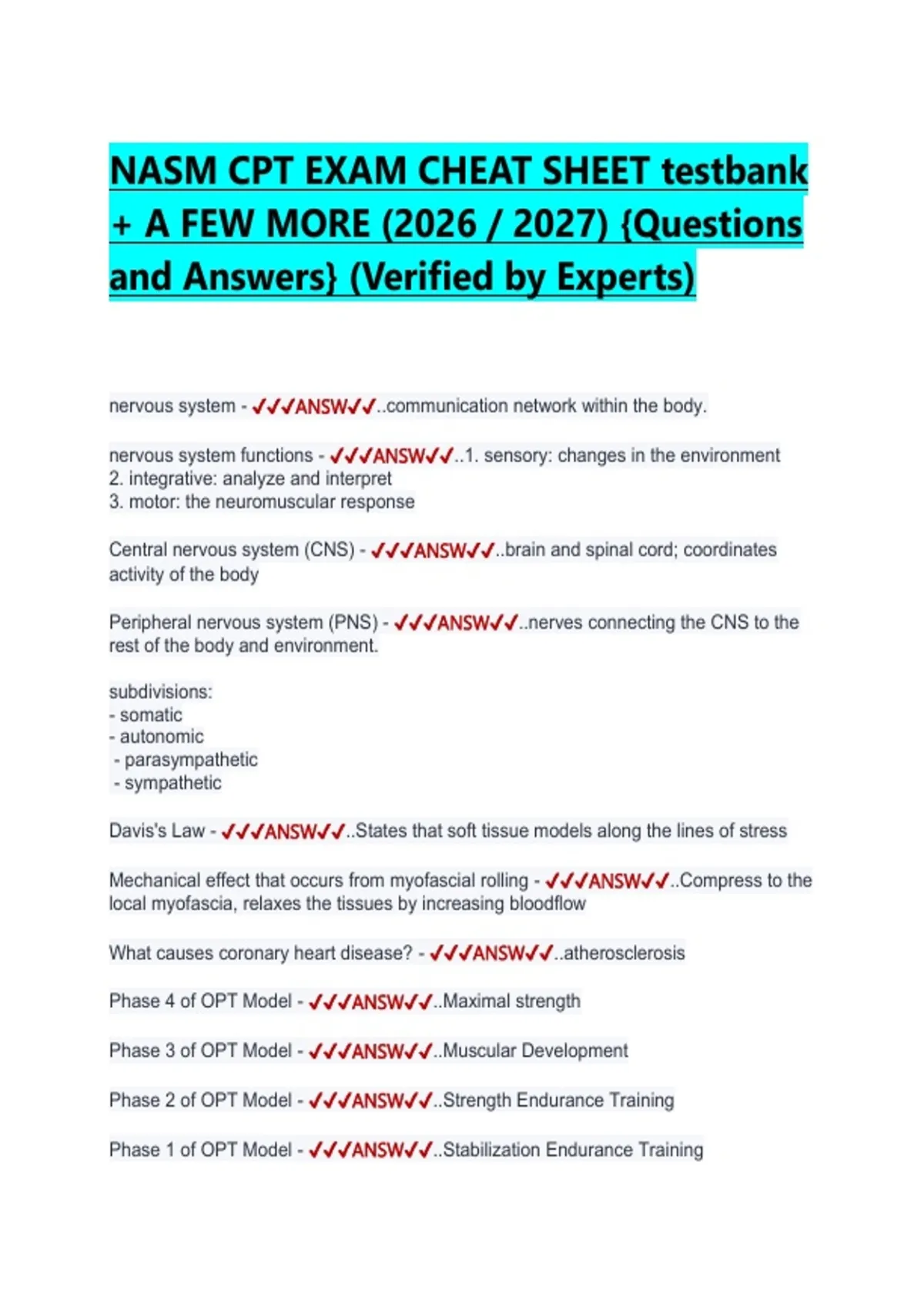 NASM CPT EXAM CHEAT SHEET testbank + A FEW MORE (2026 / 2027) {Questions and Answers} (Verified by Experts)