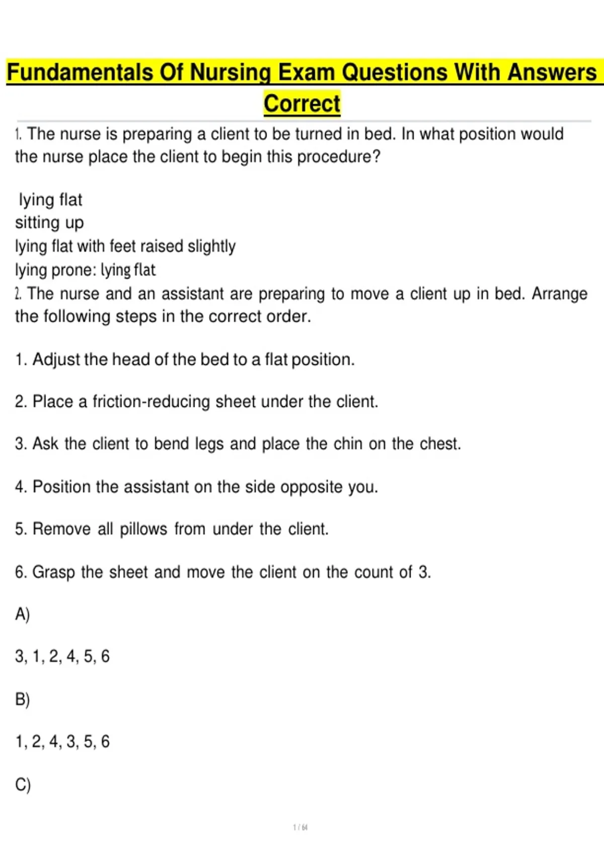 2. The nurse and an assistant are preparing to move a client up in bed. Arrange