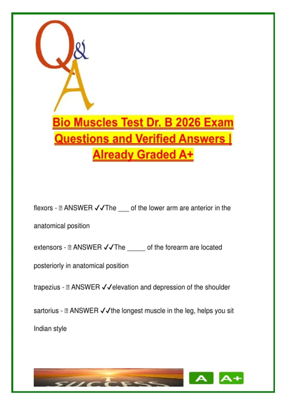 This document contains over 70 verified questions and answers from a graded A+ exam on muscle anatomy and physiology for the BIO 2026 course. It offers a detailed overview of skeletal, smooth, and cardiac muscle types, muscle locations, functions, and naming conventions. Students will explore key concepts such as muscle origin and insertion, types of movement (flexion, extension), roles (agonist, antagonist, synergist), and anatomical terminology used to classify muscles by shape, direction, size, and function. The quiz includes identification and function of specific muscles such as the quadriceps, hamstrings, biceps, triceps, gastrocnemius, deltoid, orbicularis oris, sternocleidomastoid, and many others. It also integrates real-world applications and medical concepts like muscle atrophy, hypertrophy, Botox usage, Clostridium botulinum, and hyperhidrosis. Unique attention is given to facial muscles and how expressions affect muscle structure over time. This resource is best suited for: High school and undergraduate students studying biology, anatomy, or kinesiology Students preparing for practical exams or certification tests in health and medical sciences Allied health programs covering muscular anatomy and function Instructors and tutors who need a ready-to-use exam for review or practice Keywords: muscle anatomy, muscle actions, skeletal muscle, smooth muscle, cardiac muscle, muscle naming, muscle function quiz, Botox, hyperhidrosis, clostridium botulinum, muscle atrophy, BIO 2026, quadriceps, hamstrings, facial muscles, movement types, synergist, origin insertion