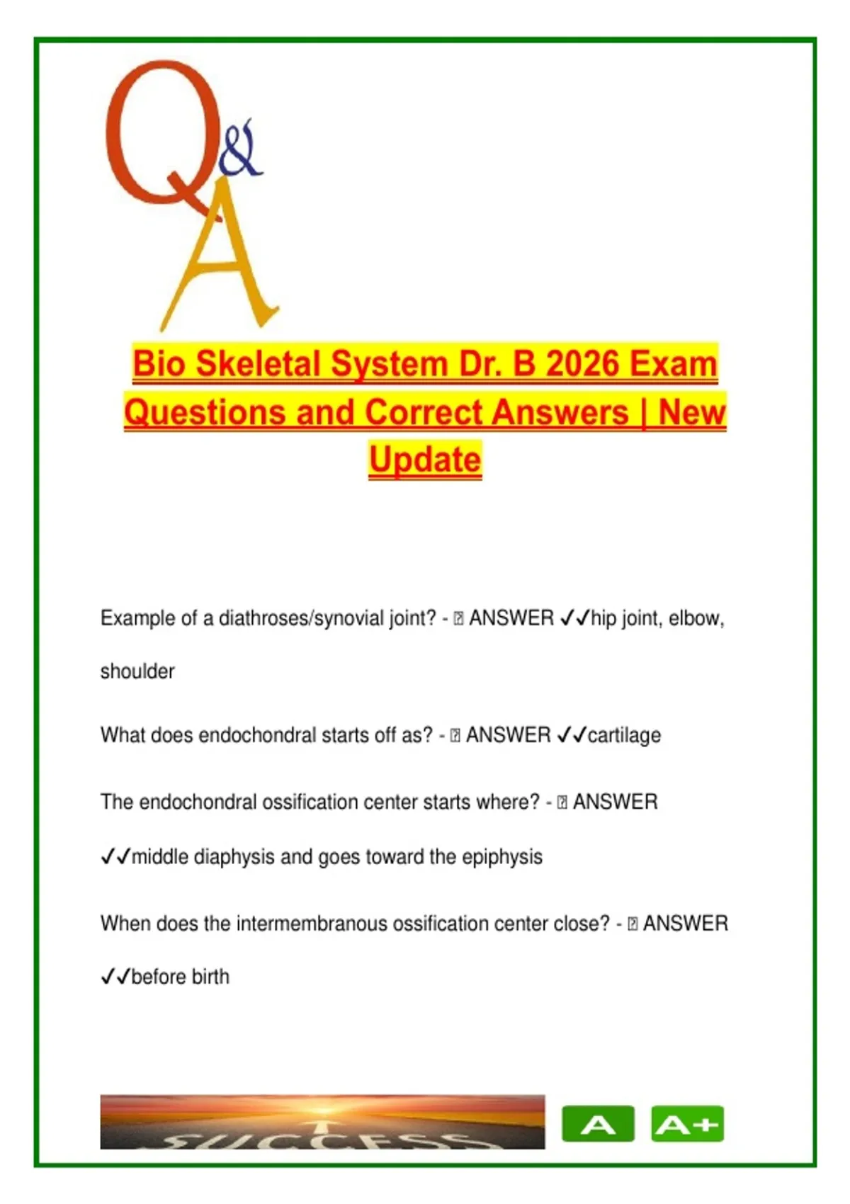 This in-depth document contains over 100 expertly verified exam questions and answers covering the full scope of the human skeletal system for BIO 2026. It spans bone development (endochondral and intramembranous ossification), growth plate physiology, bone structure (compact vs. spongy), bone marrow types, types of joints (fibrous, cartilaginous, synovial), and skeletal system functions such as protection, support, movement, and blood cell formation (hematopoiesis). Students will explore calcium regulation via hormones (calcitonin and parathormone), bone remodeling processes, and age-related changes in bone density including the risks and prevention of osteoporosis. The resource also covers types of movement (e.g., flexion, dorsiflexion, abduction), joint mechanics, and common types of fractures (greenstick, compression, spiral, compound). It concludes with functional and structural classifications of bones and joints, with detailed real-world medical connections. Ideal for: High school and college students studying human anatomy, biology, or pre-med courses Students preparing for unit exams, practicals, or standardized biology tests Allied health or kinesiology students reviewing skeletal physiology and joint function Educators and tutors needing a comprehensive assessment tool or answer key Keywords: skeletal system quiz, ossification, compact bone, spongy bone, bone marrow, endochondral development, calcium regulation, hormones in bone health, joints and movement, fracture types, osteoporosis, BIO 2026, hematopoiesis, cartilage, bone anatomy, bone growth and repair