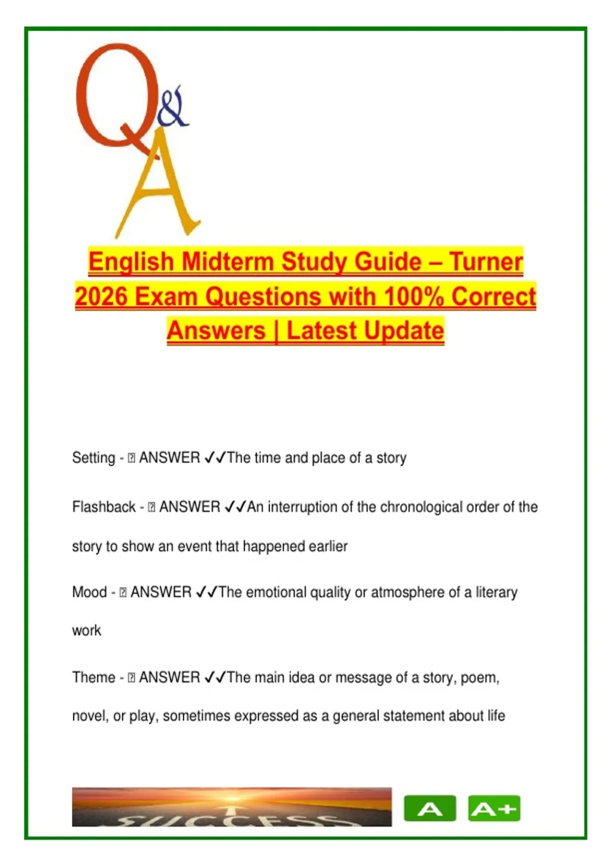 This complete midterm study guide for English III includes over 100 expertly answered questions that cover essential literary terms, poetic forms, grammar rules, and major texts studied throughout the semester. Designed for the 2026 exam, it provides concise and clear definitions of foundational concepts such as theme, tone, setting, conflict, and characterization, alongside poetic devices like meter, rhyme schemes, sonnet structures, and figurative language. Students will also review literary movements and major authors—including Shakespeare, Emily Dickinson, Robert Frost, Langston Hughes, Edgar Allan Poe, and Ray Bradbury. Additional content includes the function of pronouns, point of view distinctions, poetic forms (iambic, trochaic, anapestic), stanza types, and proper punctuation use for titles in MLA format. Core short stories and poems from the curriculum are matched with authors and key themes to aid in literary recall and essay preparation. Ideal for: High school students enrolled in English III or equivalent Students preparing for midterm exams in American literature or general English courses AP and Honors English students reviewing for literary analysis or poetry sections Teachers and tutors looking for a structured, ready-to-use Q&A reference Keywords: English III, literary terms, poetic devices, sonnets, rhyme scheme, figurative language, pronouns, stanza types, short story authors, midterm study guide, Shakespeare, Dickinson, Langston Hughes, poetic forms, English exam prep, MLA formatting