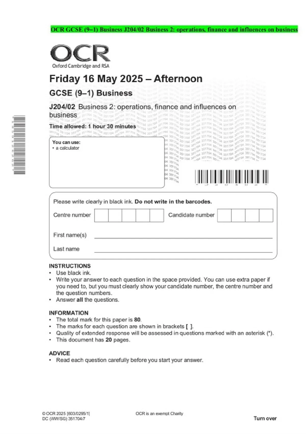 OCR GCSE (9–1) Business J204/02 Business 2: operations, finance and influences on business