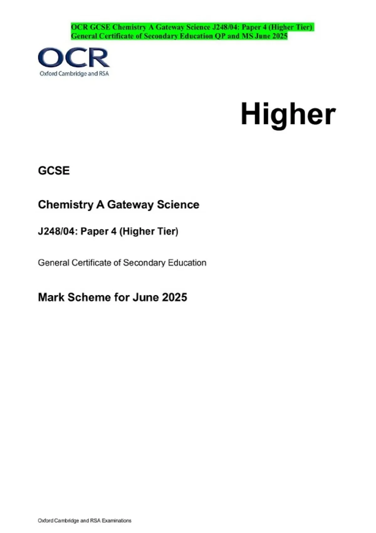 OCR GCSE Chemistry A Gateway Science J248/04: Paper 4 (Higher Tier) General Certificate of Secondary Education QP and MS June 2025