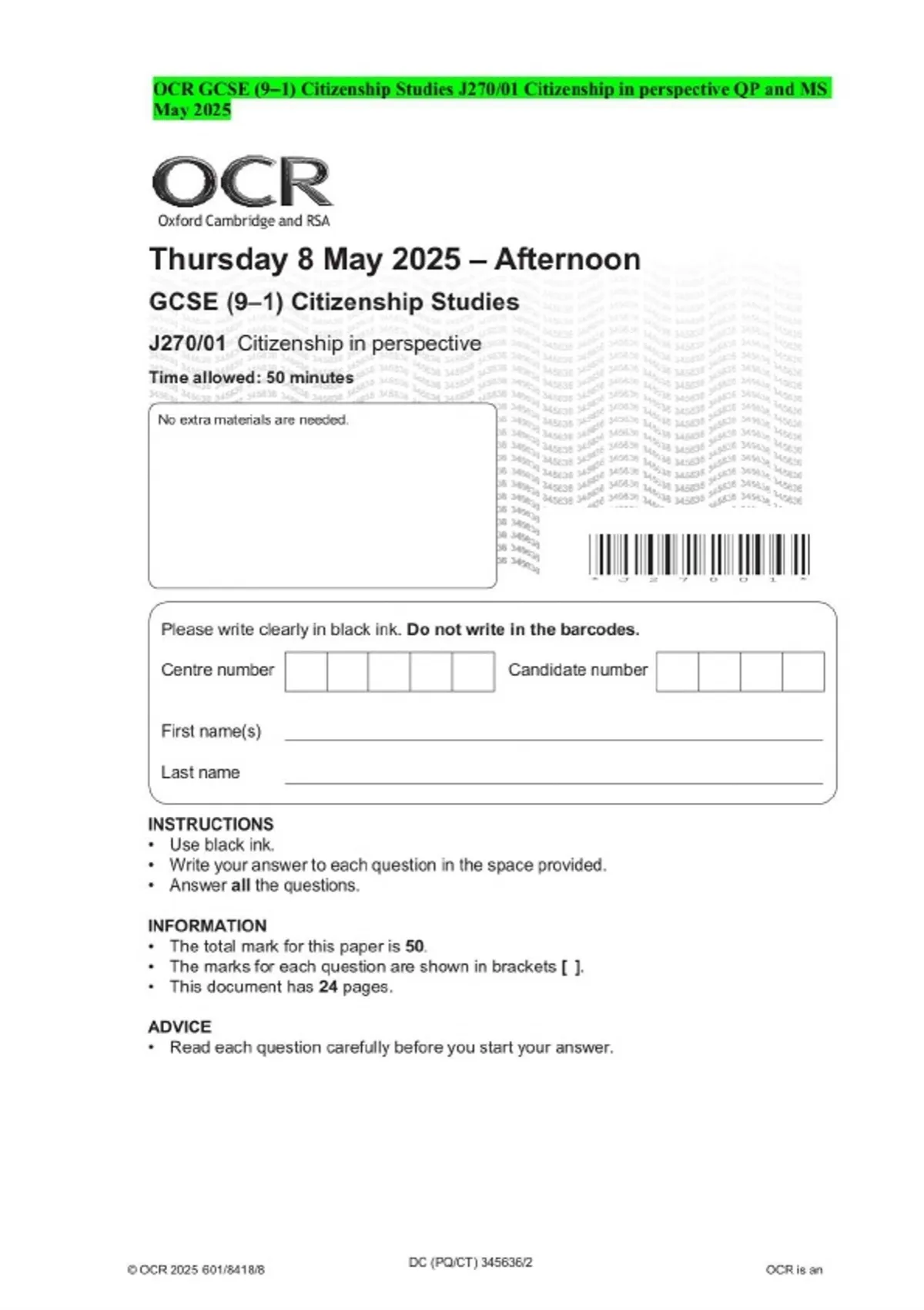 OCR GCSE (9–1) Citizenship Studies J270/01 Citizenship in perspective QP and MS May 2025