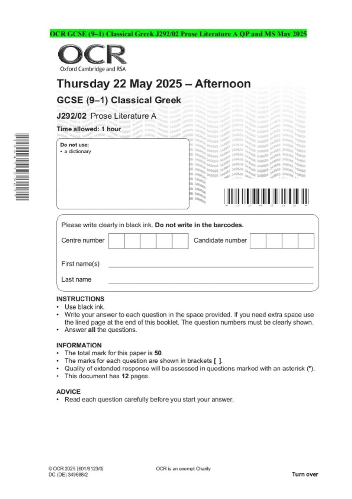 OCR GCSE (9–1) Classical Greek J292/02 Prose Literature A QP and MS May 2025