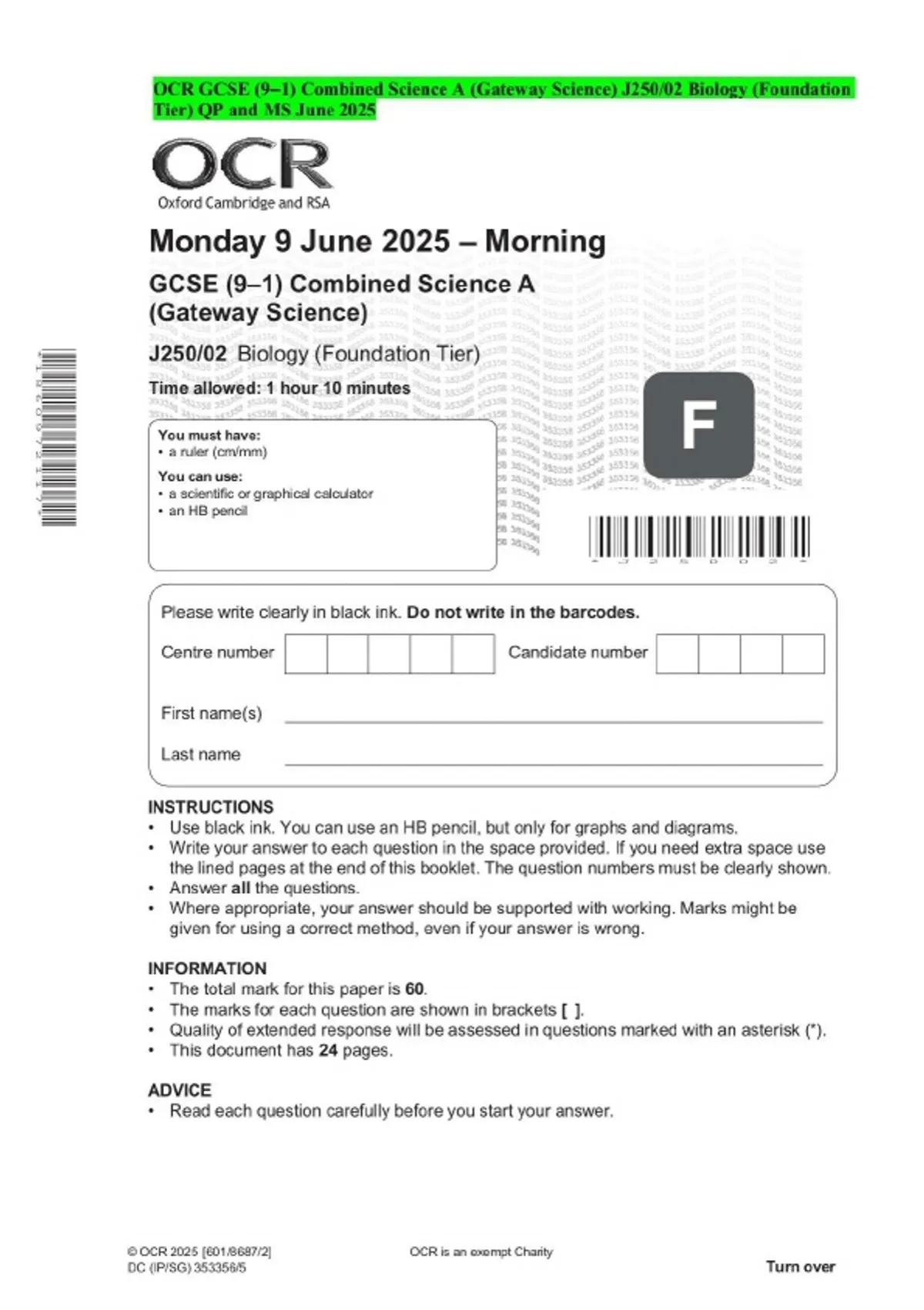 OCR GCSE (9–1) Combined Science A (Gateway Science) J250/02 Biology (Foundation Tier) QP and MS June 2025