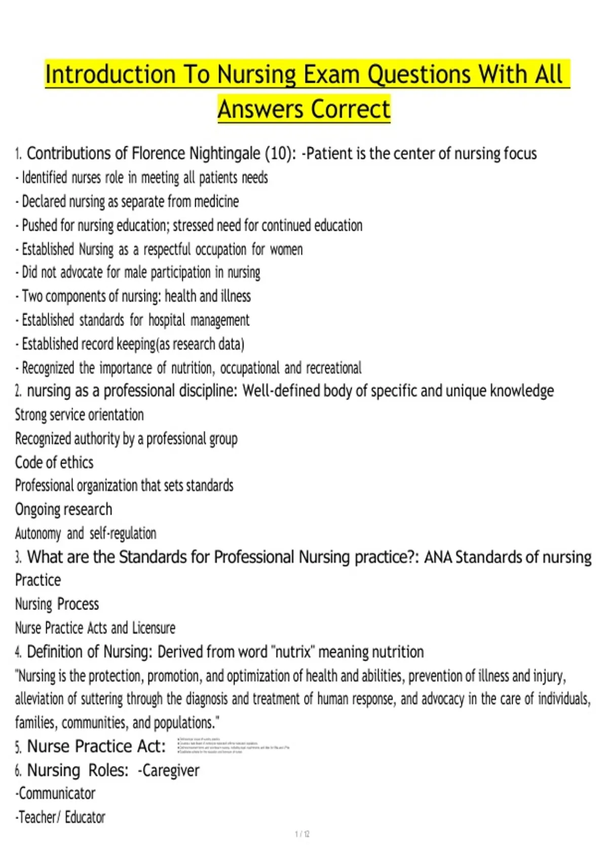 1. Contributions of Florence Nightingale (10): -Patient is the center of nursing focus