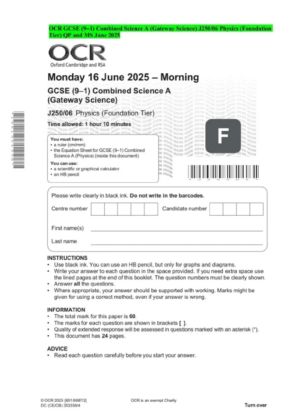OCR GCSE (9–1) Combined Science A (Gateway Science) J250/06 Physics (Foundation Tier) QP and MS June 2025