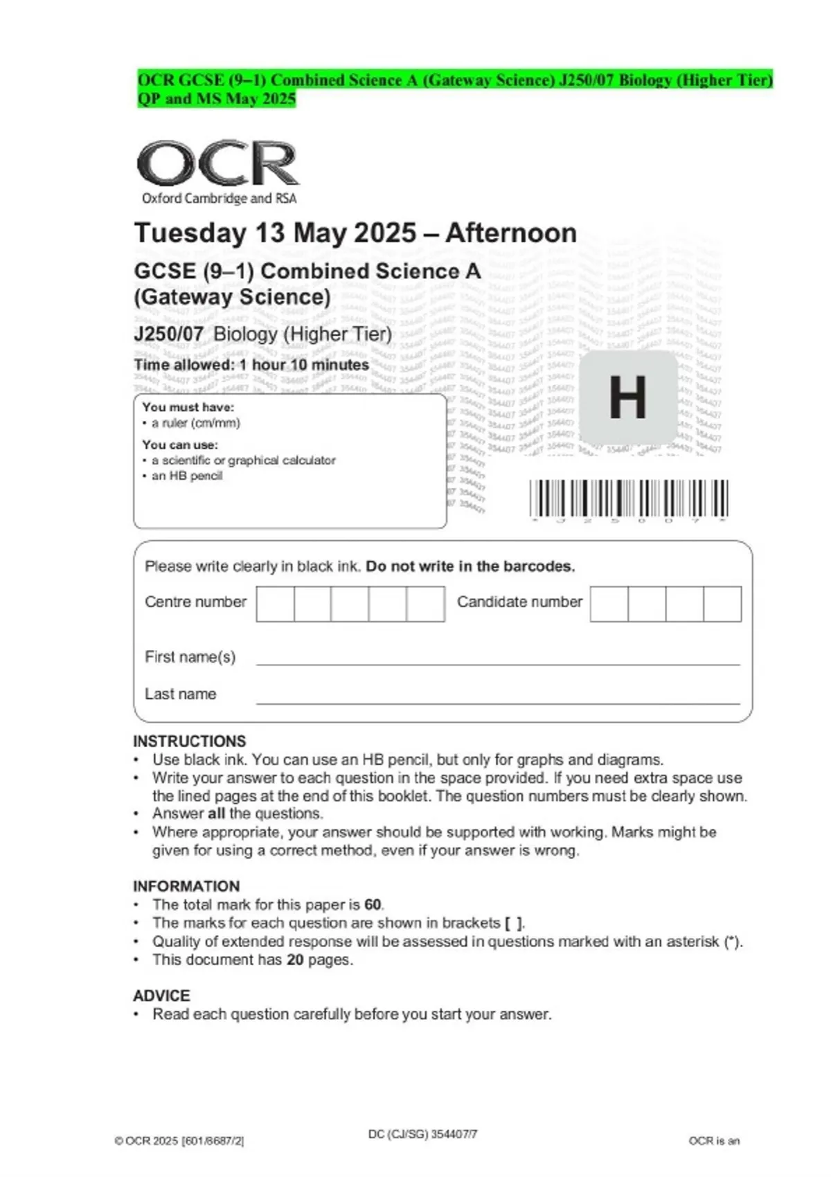 OCR GCSE (9–1) Combined Science A (Gateway Science) J250/07 Biology (Higher Tier) QP and MS May 2025
