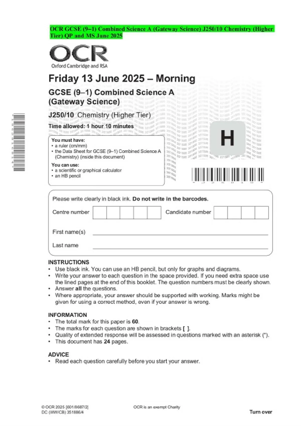 OCR GCSE (9–1) Combined Science A (Gateway Science) J250/10 Chemistry (Higher Tier) QP and MS June 2025