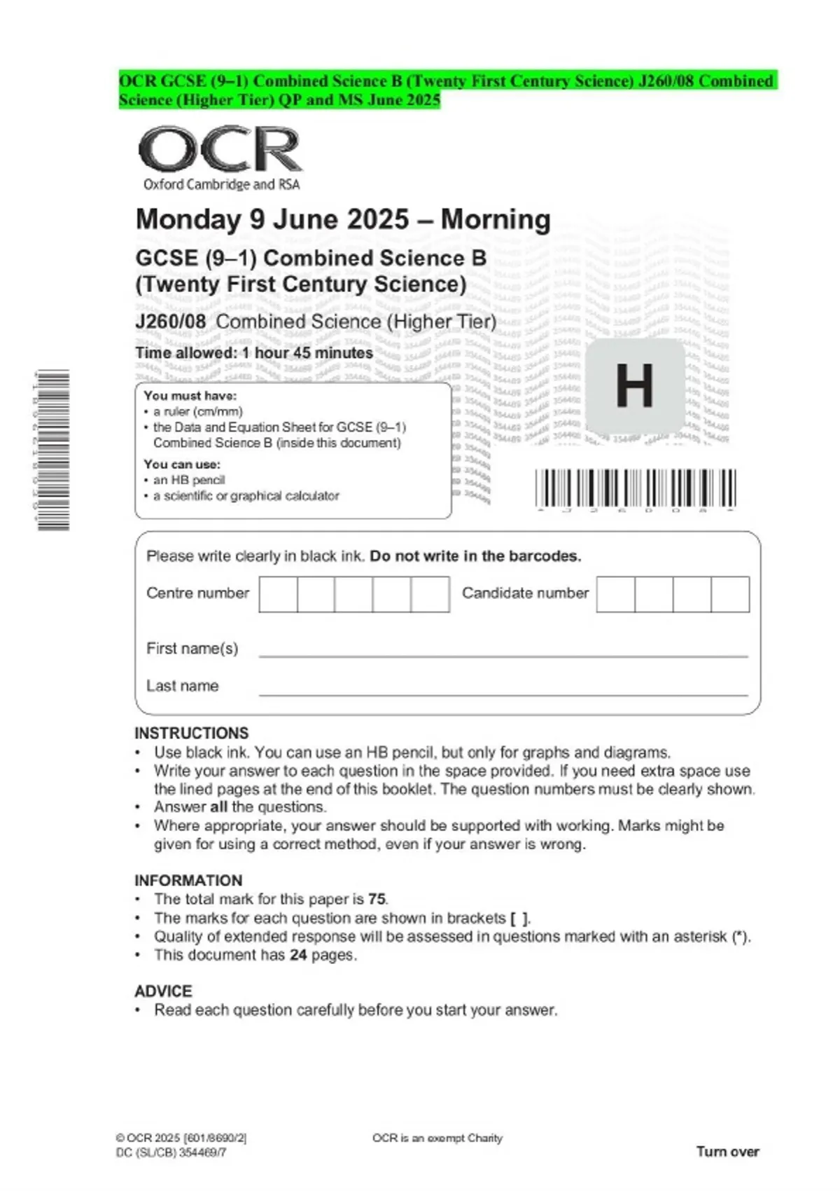 OCR GCSE (9–1) Combined Science B (Twenty First Century Science) J260/08 Combined Science (Higher Tier) QP and MS June 2025