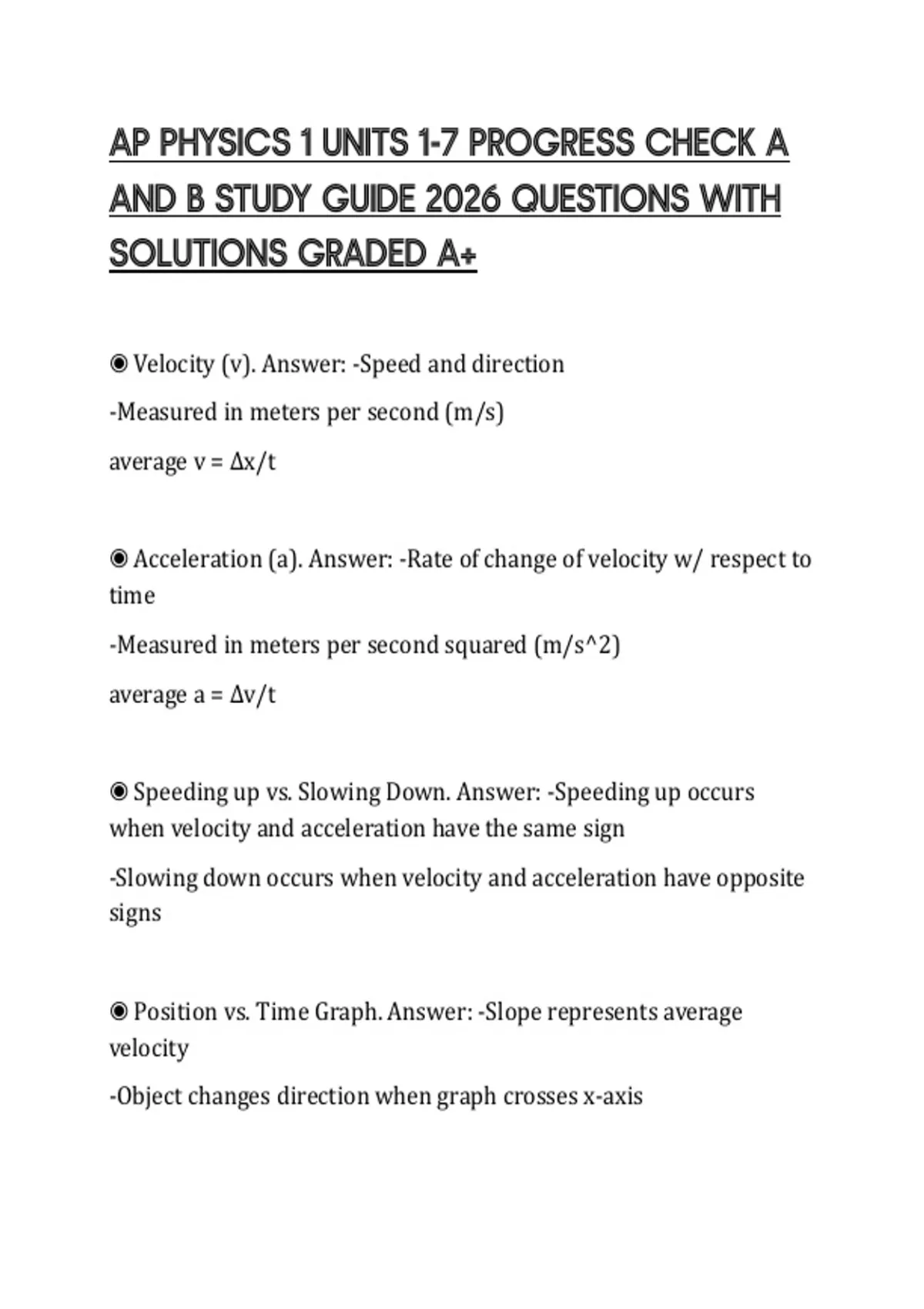 ◉ Acceleration (a). Answer: -Rate of change of velocity w/ respect to