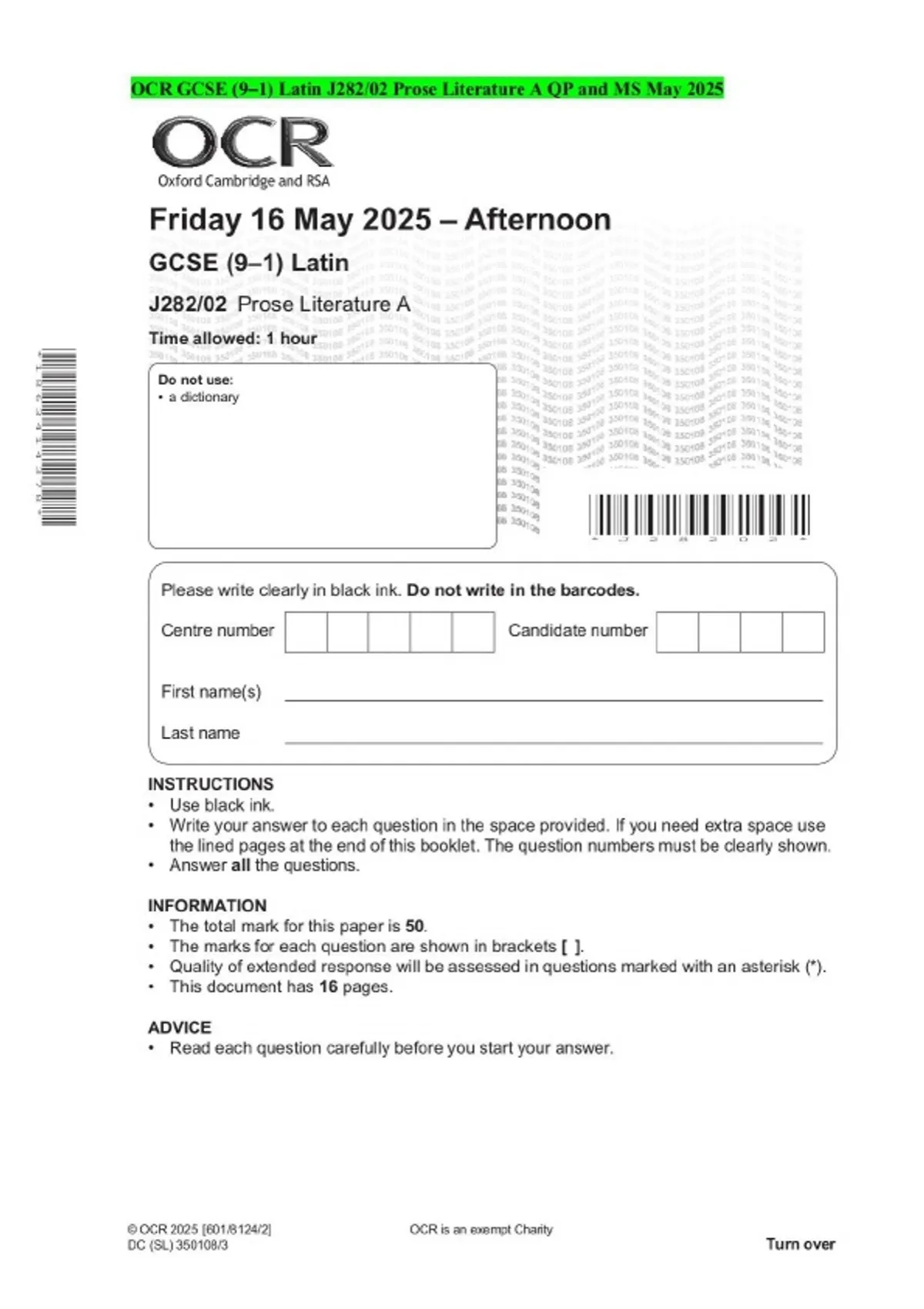 OCR GCSE (9–1) Latin J282/02 Prose Literature A QP and MS May 2025