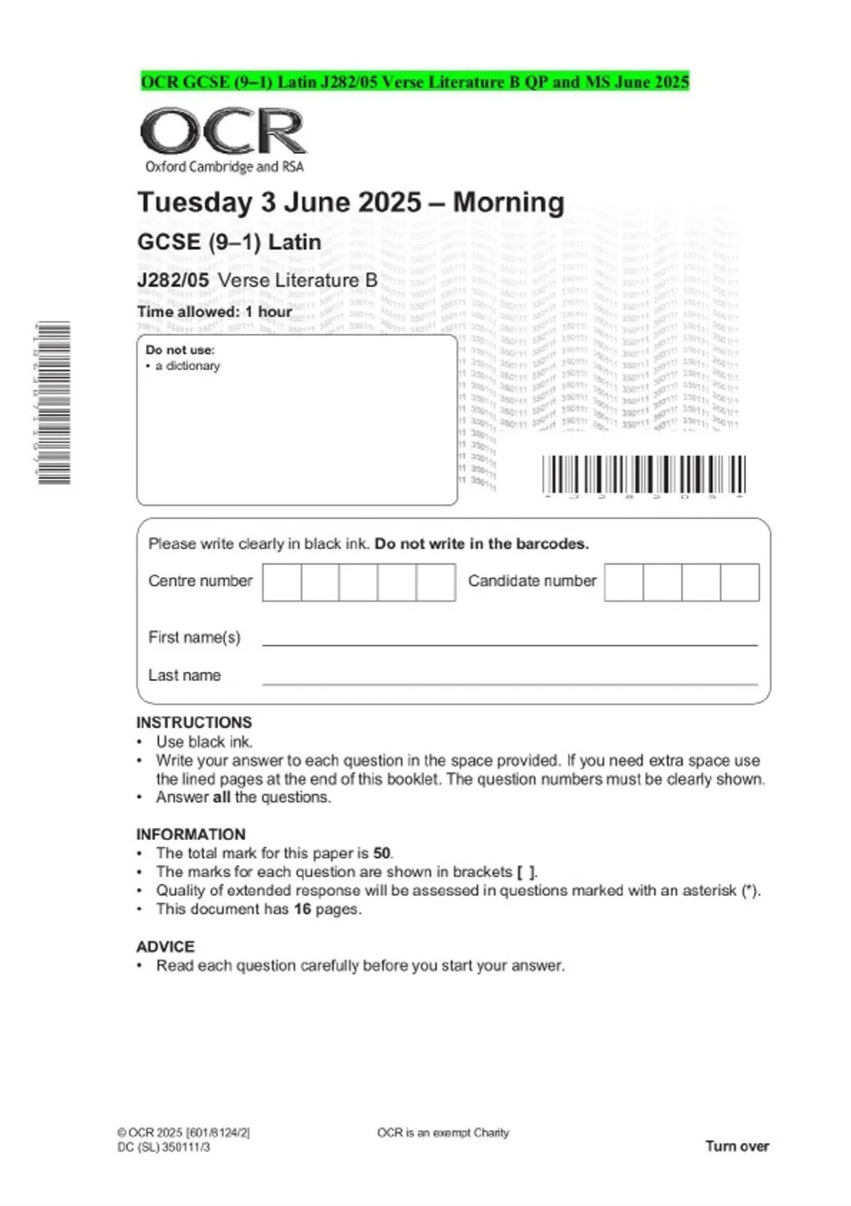OCR GCSE (9–1) Latin J282/05 Verse Literature B QP and MS June 2025