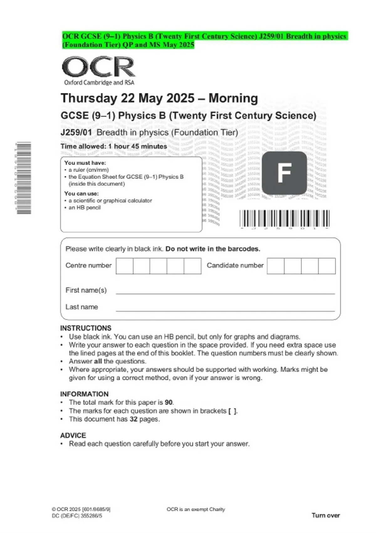OCR GCSE (9–1) Physics B (Twenty First Century Science) J259/01 Breadth in physics (Foundation Tier) QP and MS May 2025