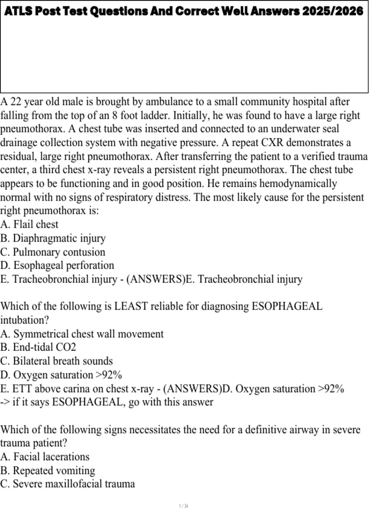 , ATLS Post Test Questions And Correct Well Answers 2025/2026