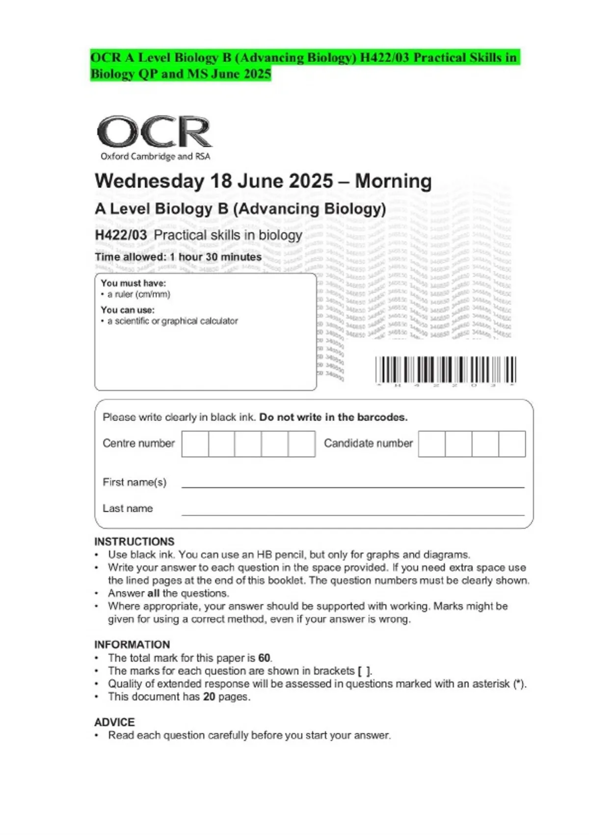 OCR A Level Biology B (Advancing Biology) H422/03 Practical Skills in Biology QP and MS June 2025
