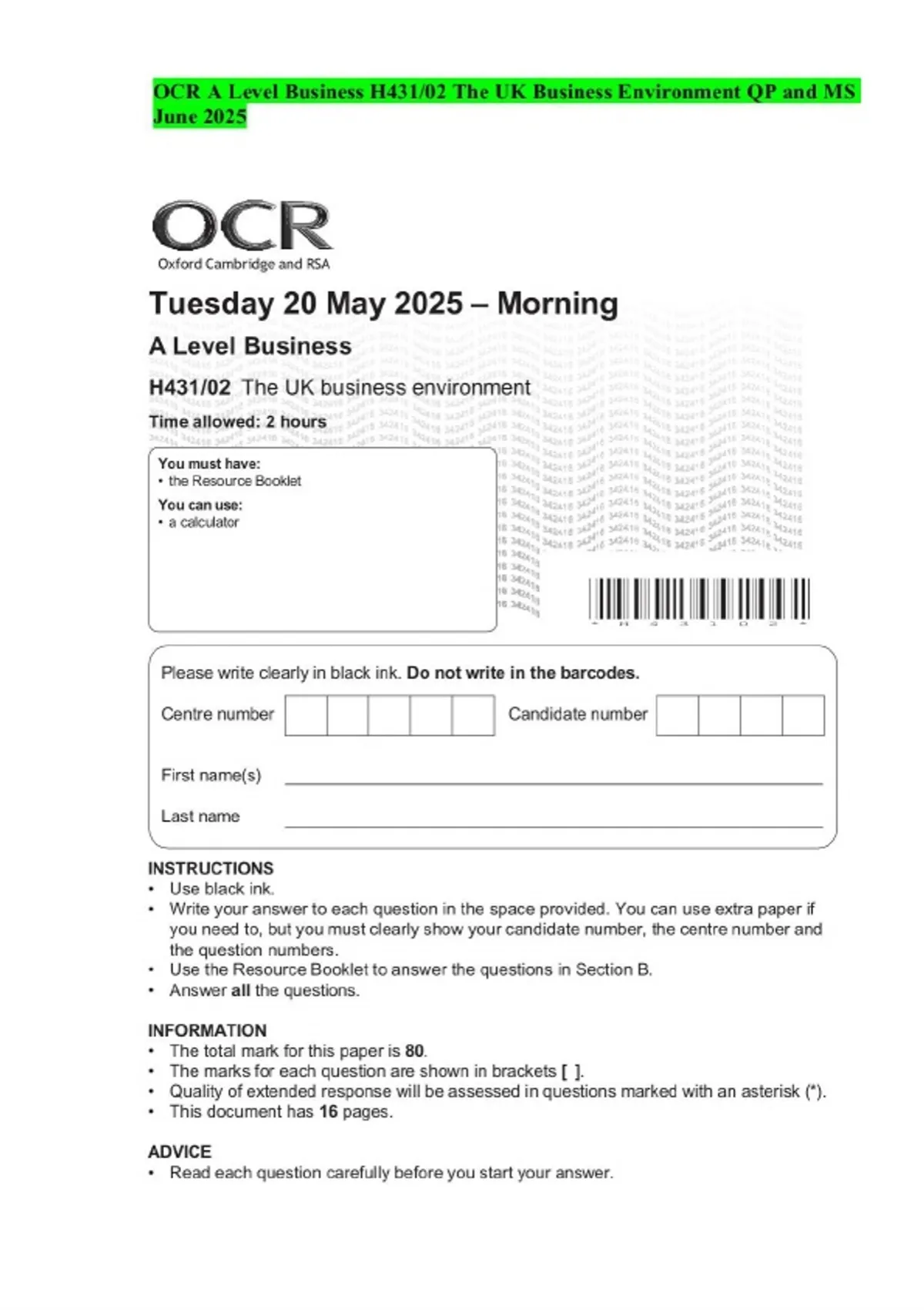OCR A Level Business H431/02 The UK Business Environment QP and MS June 2025