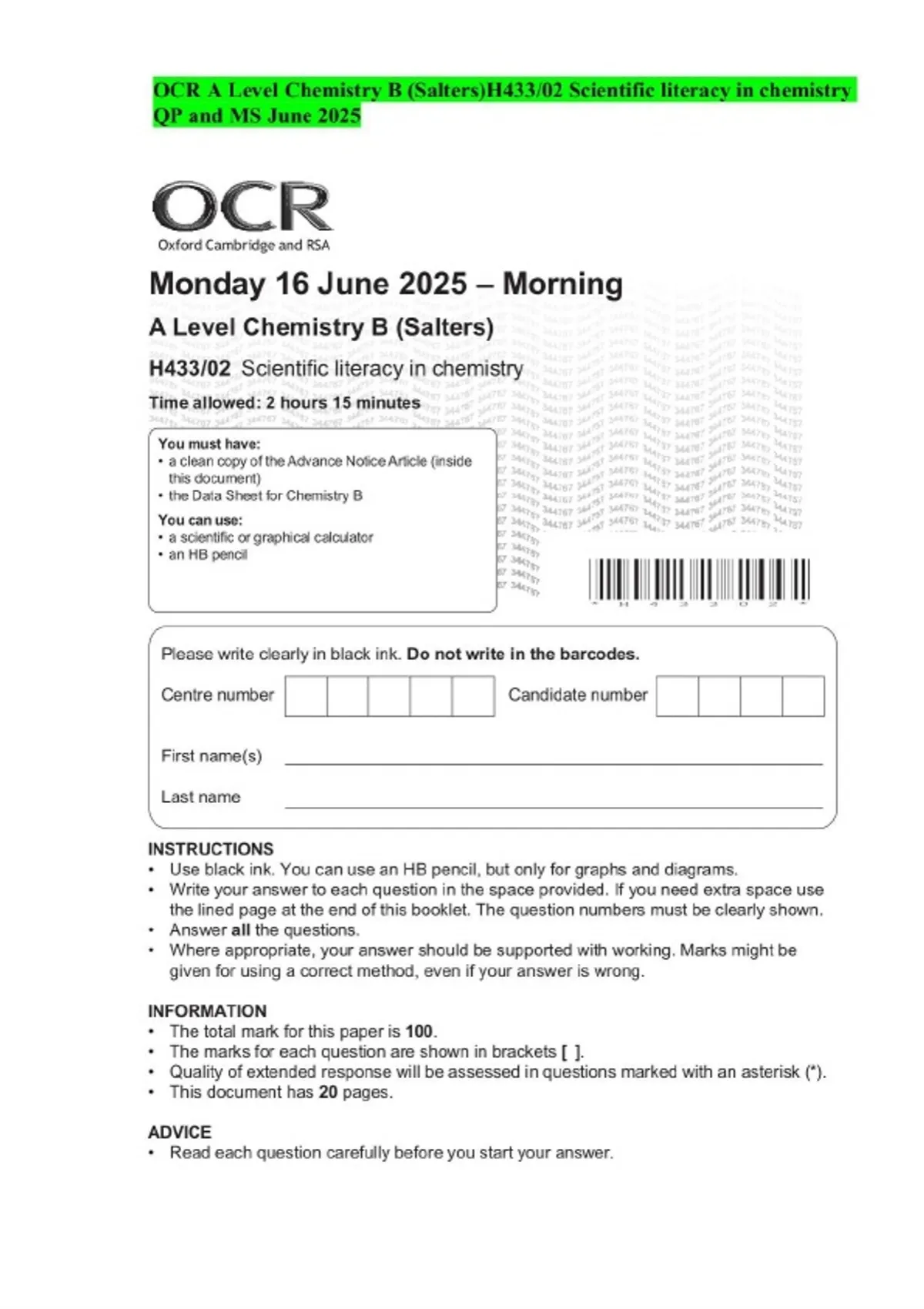 OCR A Level Chemistry B (Salters)H433/02 Scientific literacy in chemistry QP and MS June 2025
