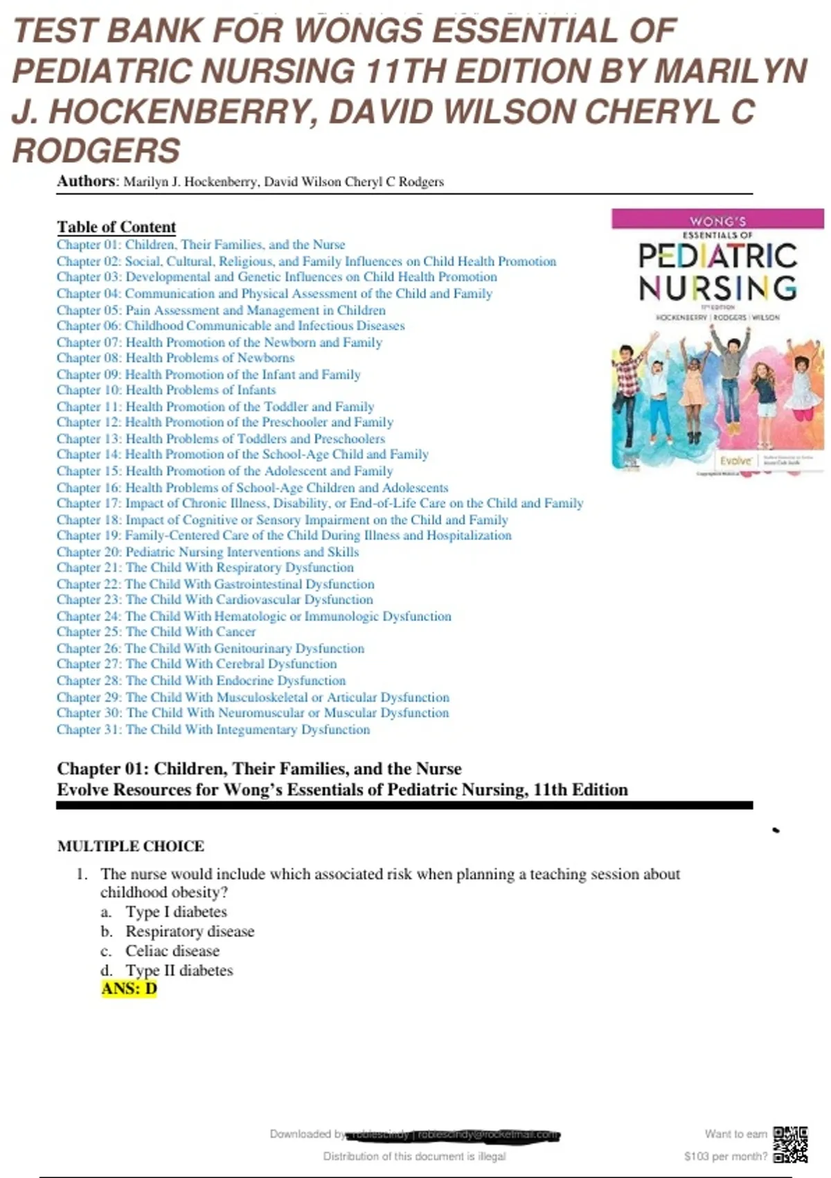 Wong’s Essentials of Pediatric Nursing (11th Edition) – Hockenberry, Rodgers & Wilson | Test Bank & Study Guide