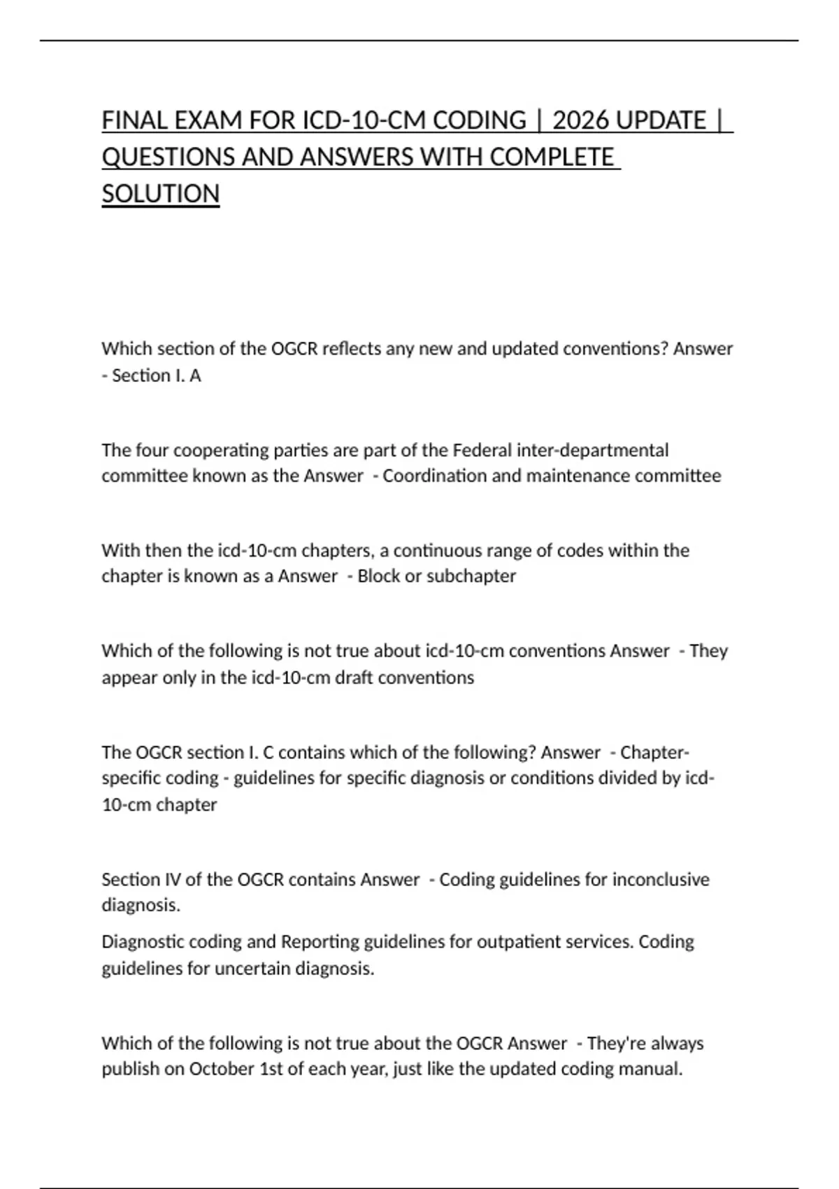 FINAL EXAM FOR ICD-10-CM CODING | 2026 UPDATE | QUESTIONS AND ANSWERS WITH COMPLETE SOLUTION