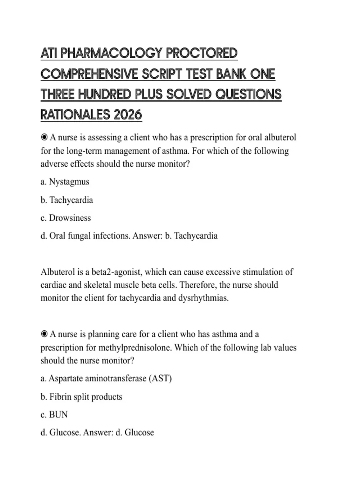 ATI PHARMACOLOGY PROCTORED COMPREHENSIVE SCRIPT TEST BANK ONE THREE HUNDRED PLUS SOLVED QUESTIONS RATIONALES 2026