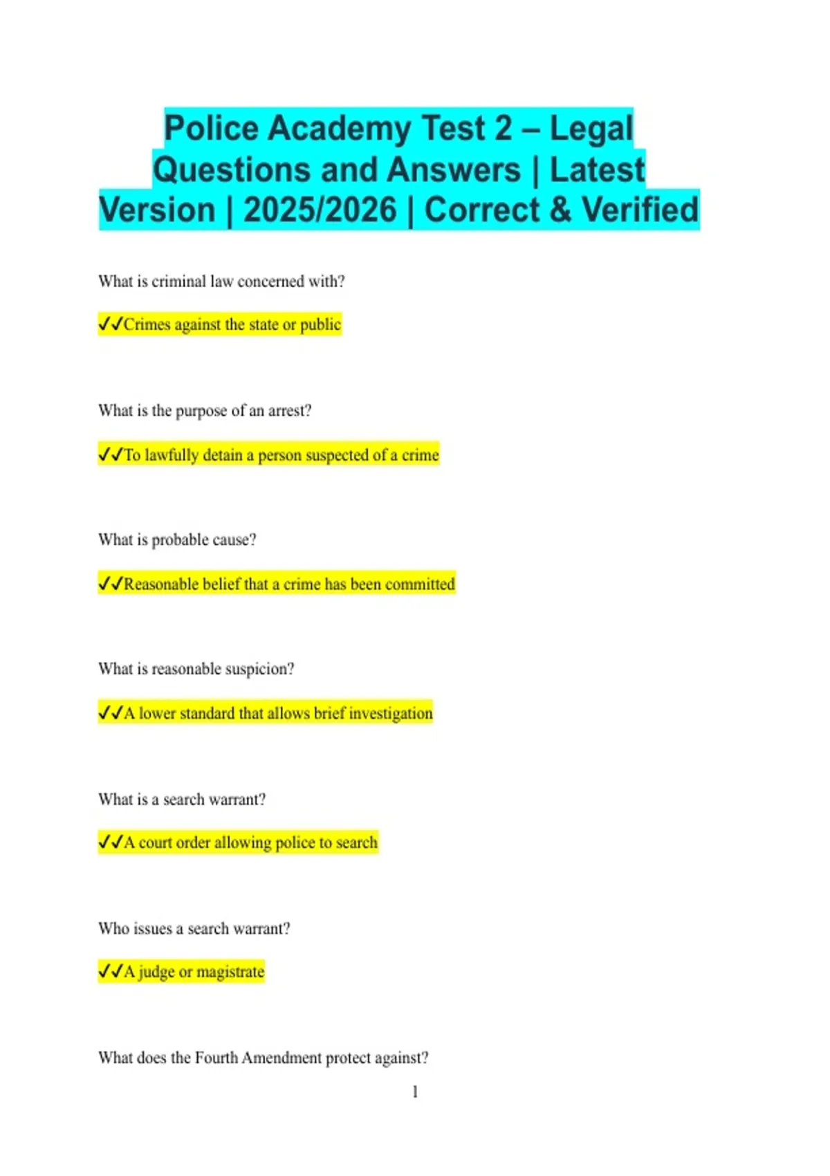 Police Academy Test 2 – Legal Questions and Answers | Latest Version | 2025/2026 | Correct & Verified What is criminal law concerned with? Crimes against the state or public What is the purpose of an arrest? To lawfully detain a person suspected of a crime What is probable cause? Reasonable belief that a crime has been committed What is reasonable suspicion? A lower standard that allows brief investigation What is a search warrant? A court order allowing police to search Who issues a search warrant? A judge or magistrate What does the Fourth Amendment protect against? 2 Unreasonable searches and seizures What is Miranda warning? A statement of rights read to a suspect When must Miranda rights be given? Before custodial interrogation What is custodial interrogation? Questioning when a person is not free to leave What is the exclusionary rule? Illegally obtained evidence cannot be used What is chain of custody? Documentation of who handled evidence What is a felony? A serious crime punishable by more than one year What is a misdemeanor? A less serious crime 3 What is due process? Fair treatment under the law What is a lawful detention? Temporary stop based on reasonable suspicion What is an arrest warrant? Court order to arrest a person What is self-incrimination? Providing evidence against oneself What is the Fifth Amendment right? Protection against self-incrimination What is the Sixth Amendment right? Right to a lawyer What is double jeopardy? Being tried twice for the same crime 4 What is an affidavit? A sworn written statement What is jurisdiction? Authority to enforce the law in an area What is a subpoena? Order to appear in court What is contempt of court? Disobeying a court order What is evidence? Information used to prove a fact What is direct evidence? Evidence that proves a fact without inference What is circumstantial evidence? Evidence that implies a fact What is an alibi?
