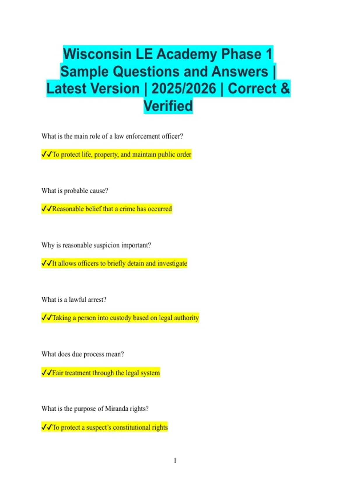 Wisconsin LE Academy Phase 1 Sample Questions and Answers | Latest Version | 2025/2026 | Correct & Verified What is the main role of a law enforcement officer? To protect life, property, and maintain public order What is probable cause? Reasonable belief that a crime has occurred Why is reasonable suspicion important? It allows officers to briefly detain and investigate What is a lawful arrest? Taking a person into custody based on legal authority What does due process mean? Fair treatment through the legal system What is the purpose of Miranda rights? To protect a suspect’s constitutional rights 2 When must Miranda rights be given? Before custodial interrogation What is a search warrant? A court order allowing a search Who issues a search warrant? A judge or magistrate What is exigent circumstances? Emergency situations allowing immediate action What does plain view mean? Evidence visible without a search What is use of force? The amount of force an officer uses to control a situation Why is use of force regulated? To protect public and officer safety What is community policing? 3 Working with the community to prevent crime What is jurisdiction? The area where an officer has authority What is a citation? A written notice to appear in court What is a felony? A serious crime punishable by prison What is a misdemeanor? A less serious criminal offense What is an arrest warrant? A court order to arrest a person What is bail? Money paid to ensure court appearance What is evidence? Information used to prove a fact 4 What is chain of custody? The documented handling of evidence Why is chain of custody important? To ensure evidence is not tampered with What is a traffic stop? A lawful stop of a vehicle by police Why must officers identify themselves? To show legal authority What is self-defense in law enforcement? Using force to protect oneself or others What is an affidavit? A written sworn statement What is a subpoena? A court order to appear or provide