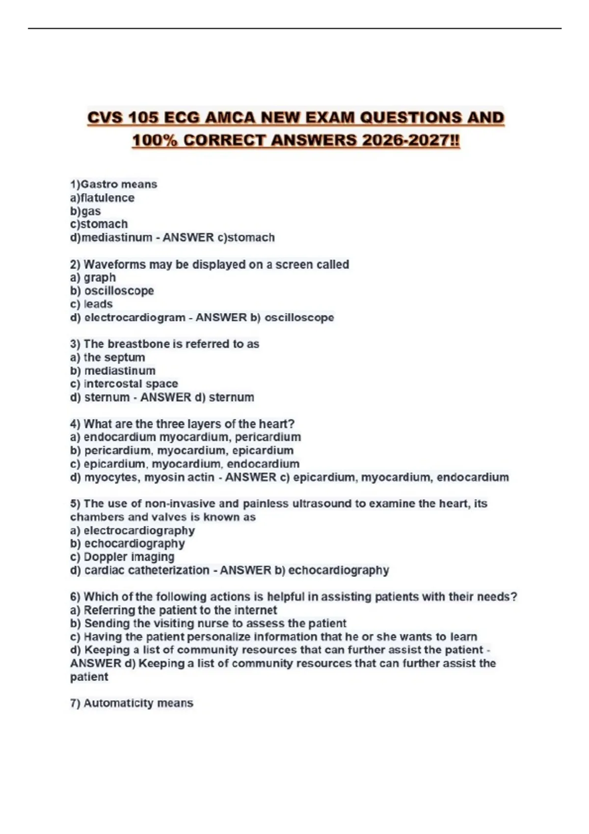 CVS 105 ECG AMCA NEW EXAM QUESTIONS AND 100% CORRECT ANSWERS !!