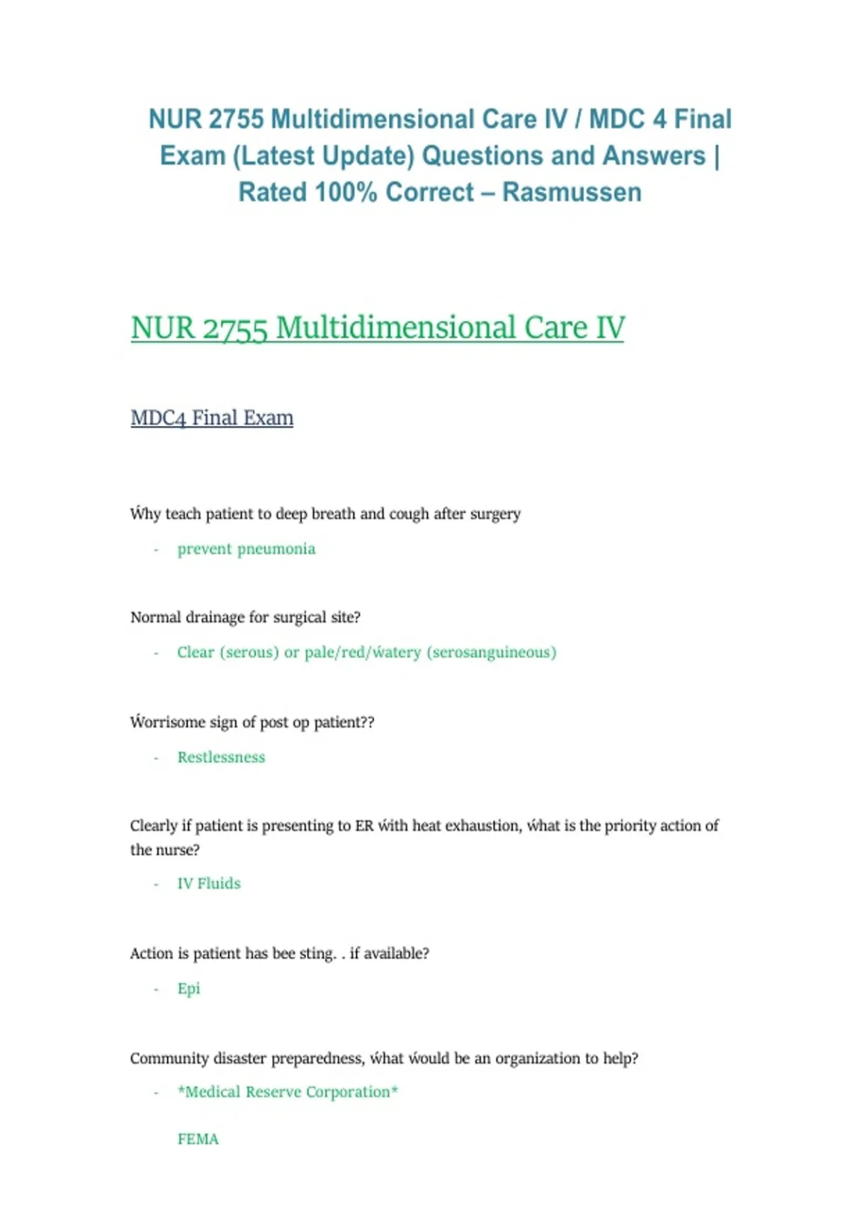 This document provides the latest updated NUR 2755 (Multidimensional Care IV / MDC 4) final exam questions and answers for Rasmussen University. It covers comprehensive clinical concepts, advanced nursing interventions, patient care priorities, and critical-thinking scenarios commonly assessed on the MDC 4 final exam. The material is structured for effective revision, self-testing, and confident final exam preparation.