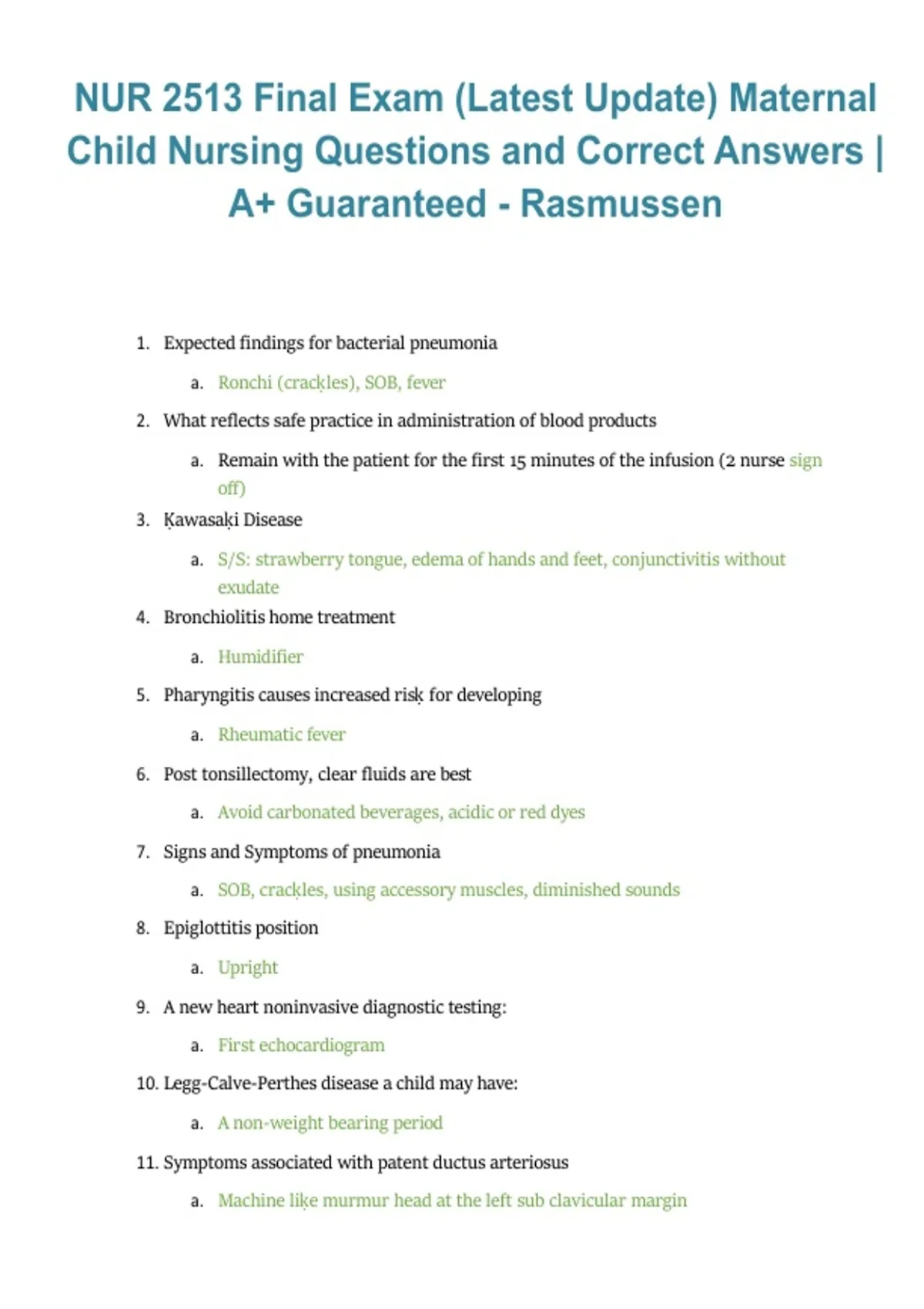 This document provides the latest updated NUR 2513 (Maternal-Child Nursing) final exam for Rasmussen University, featuring questions with fully verified correct answers and an A+ guarantee. It covers maternal and child health concepts, clinical scenarios, nursing interventions, and patient care priorities commonly assessed in the final exam. The material is designed for thorough revision, self-testing, and confident exam preparation.