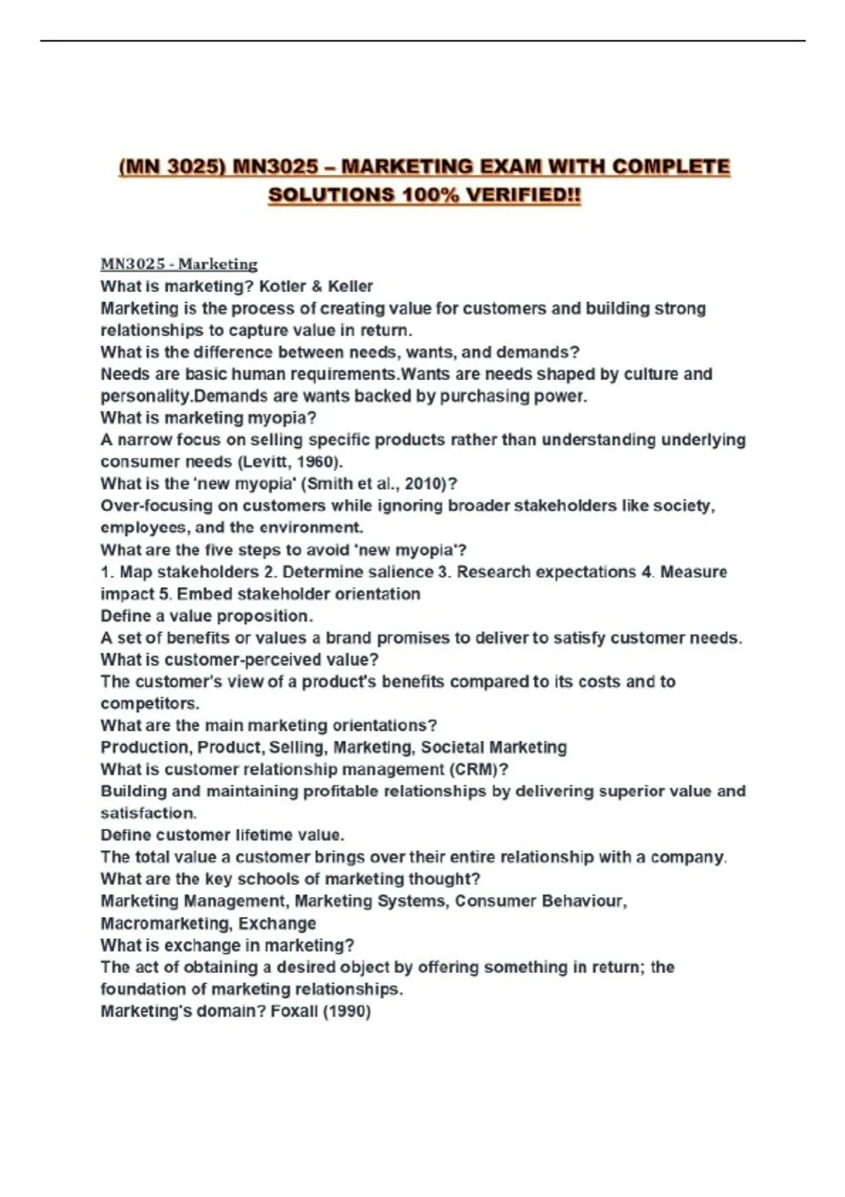 (MN 3025) MN3025 – MARKETING EXAM WITH COMPLETE SOLUTIONS 100% VERIFIED!!...