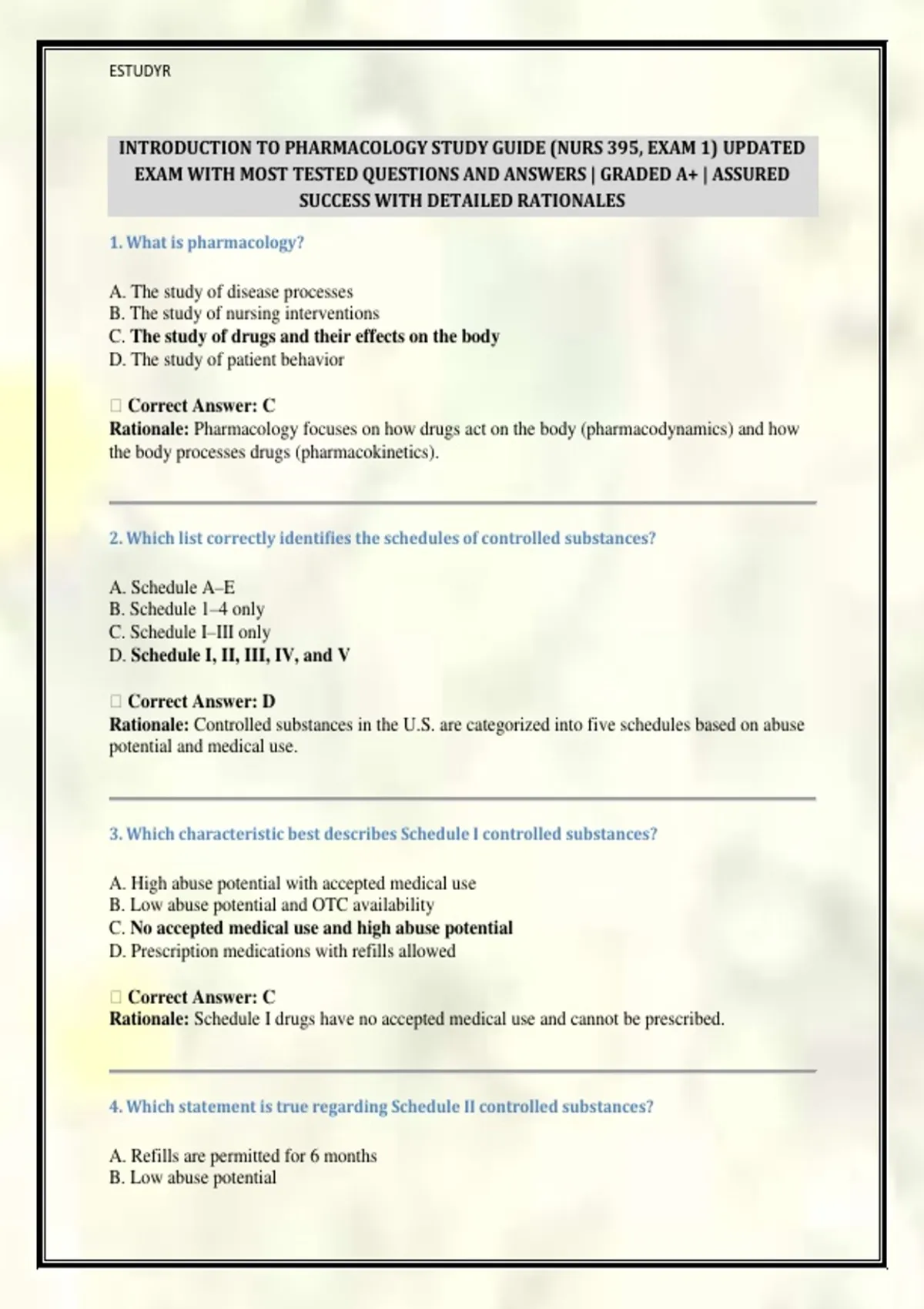 INTRODUCTION TO PHARMACOLOGY STUDY GUIDE (NURS 395, EXAM 1) UPDATED