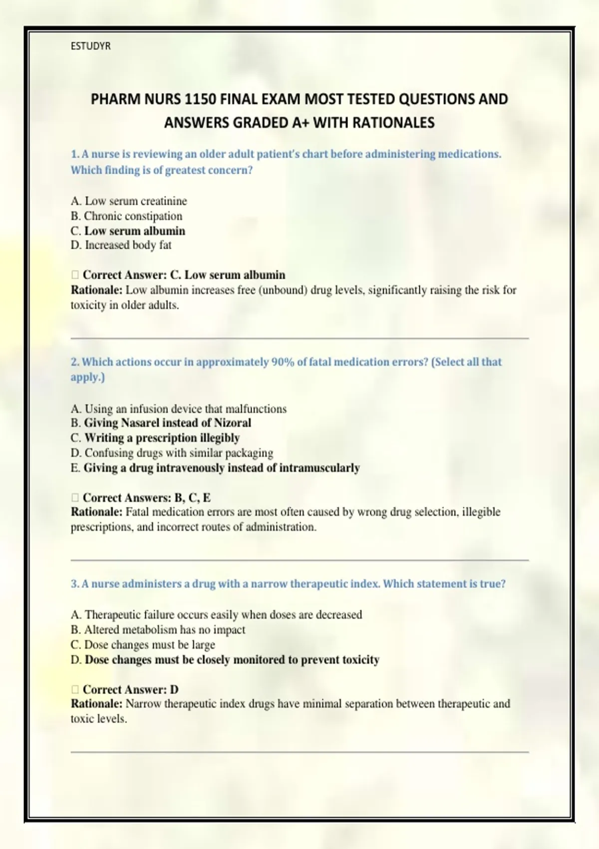 PHARM NURS 1150 FINAL EXAM MOST TESTED QUESTIONS AND